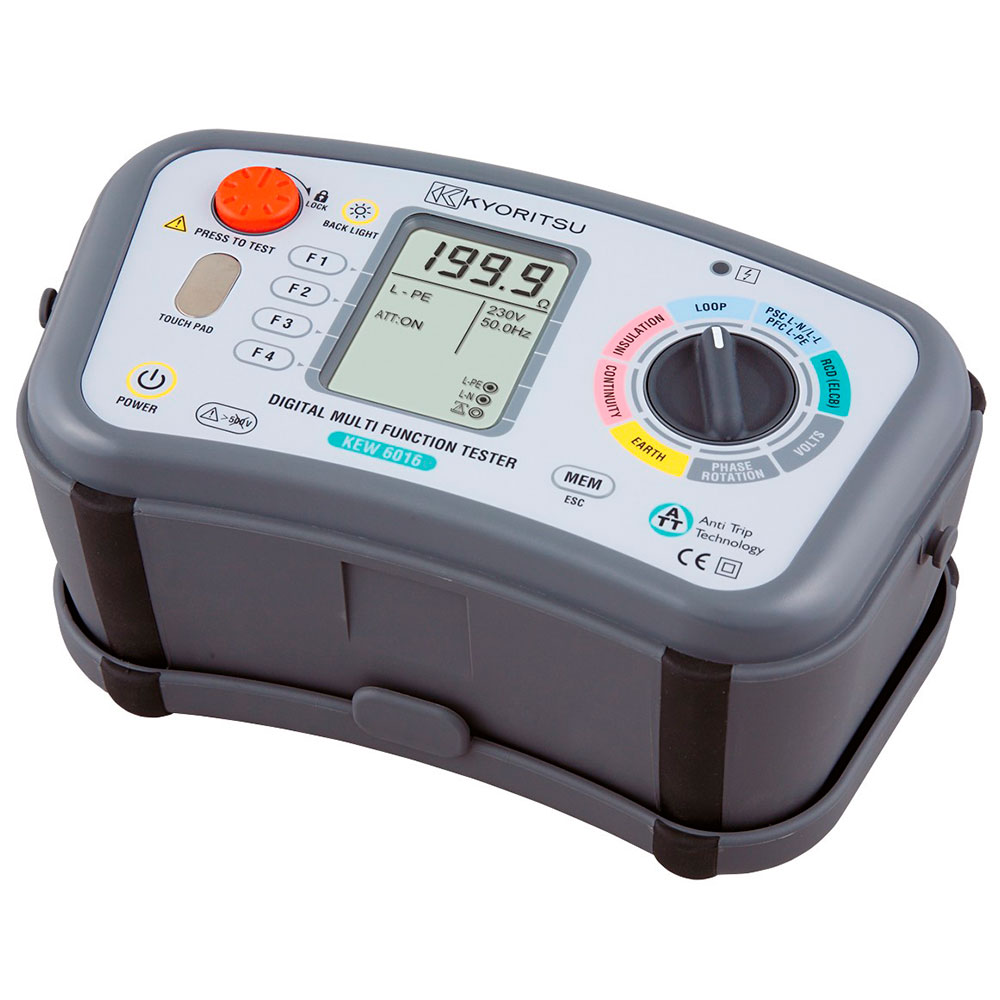 Многофункциональный измеритель Kyoritsu KEW Model 6016 - это 10 измерителей в одном: тестер целостности цепи; мегаомметр (измеритель сопротивления изоляции); измеритель сопротивления петли "Фаза-Ноль"; измеритель ожидаемого тока короткого замыкания (ОТКЗ, PSC); измеритель ожидаемого тока повреждения (ОТП, PFC); измеритель параметров УЗО; тестер заземления; вольтметр; тестер чередования фаз; измеритель частоты.