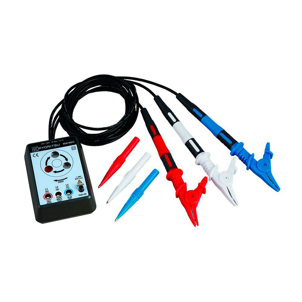 Портативный указатель фаз (фазоуказатель, индикатор фаз) Kyoritsu KEW Model 8031CE предназначен для быстрой проверки разомкнутости и чередования фаз в широком диапазоне трехфазных источников питания.
