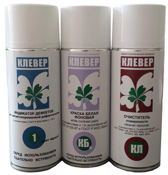 Набор расходных материалов для проведения магнитопорошковой дефектоскопии мокрым методом по ГОСТ Р 56612-2015, состоящий из очистителя поверхности, белого грунта и магнитного индикатора.