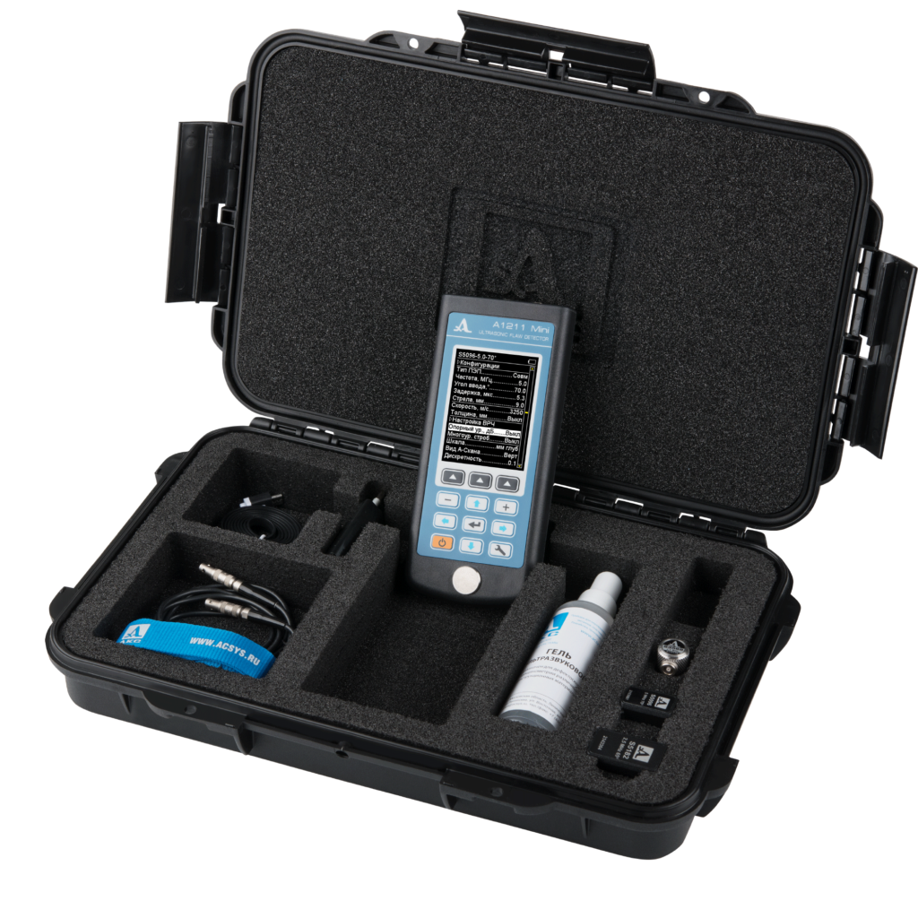 Главной особенностью прибора является небольшой вес и габариты, что позволяет работать в сложных и стесненных условиях, а также делают дефектоскоп удобным при поездках и командировках.