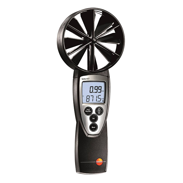 Компактный анемометр testo 417 со встроенной крыльчаткой для измерения скорости воздуха и температуры диаметром 100 мм, для измерения скорости потока, объемного расхода и температуры.
