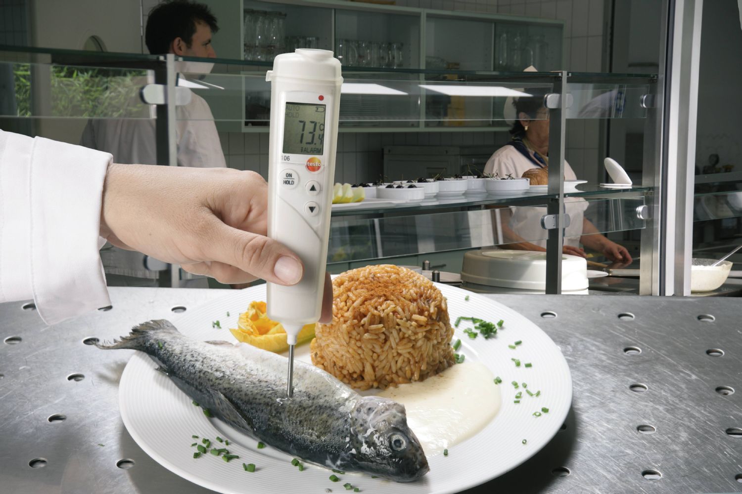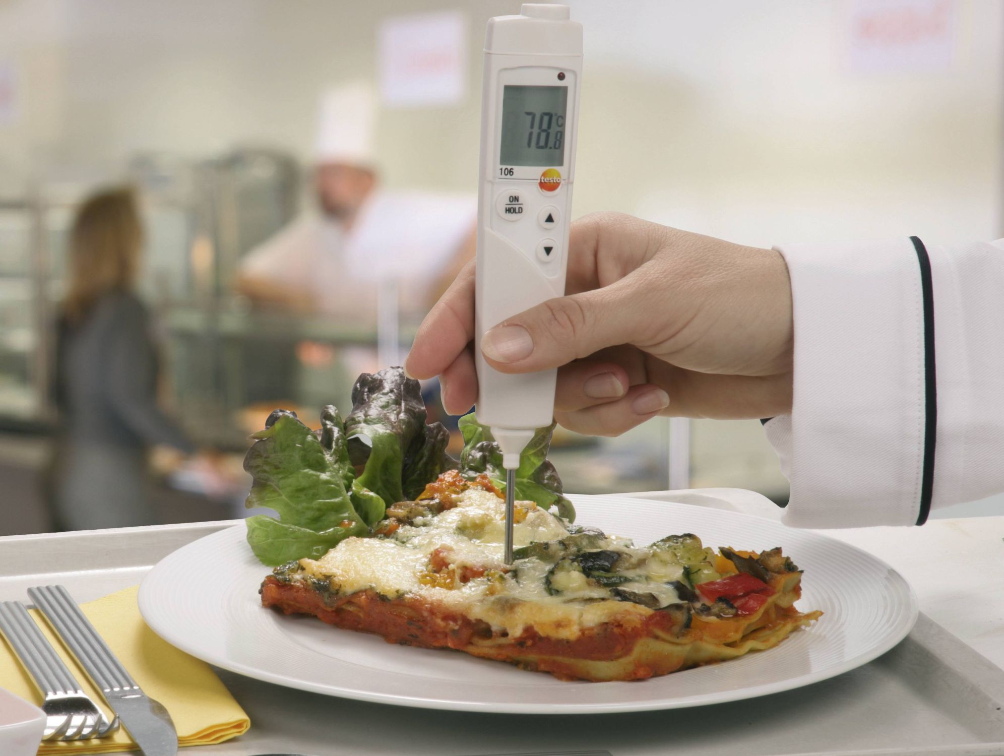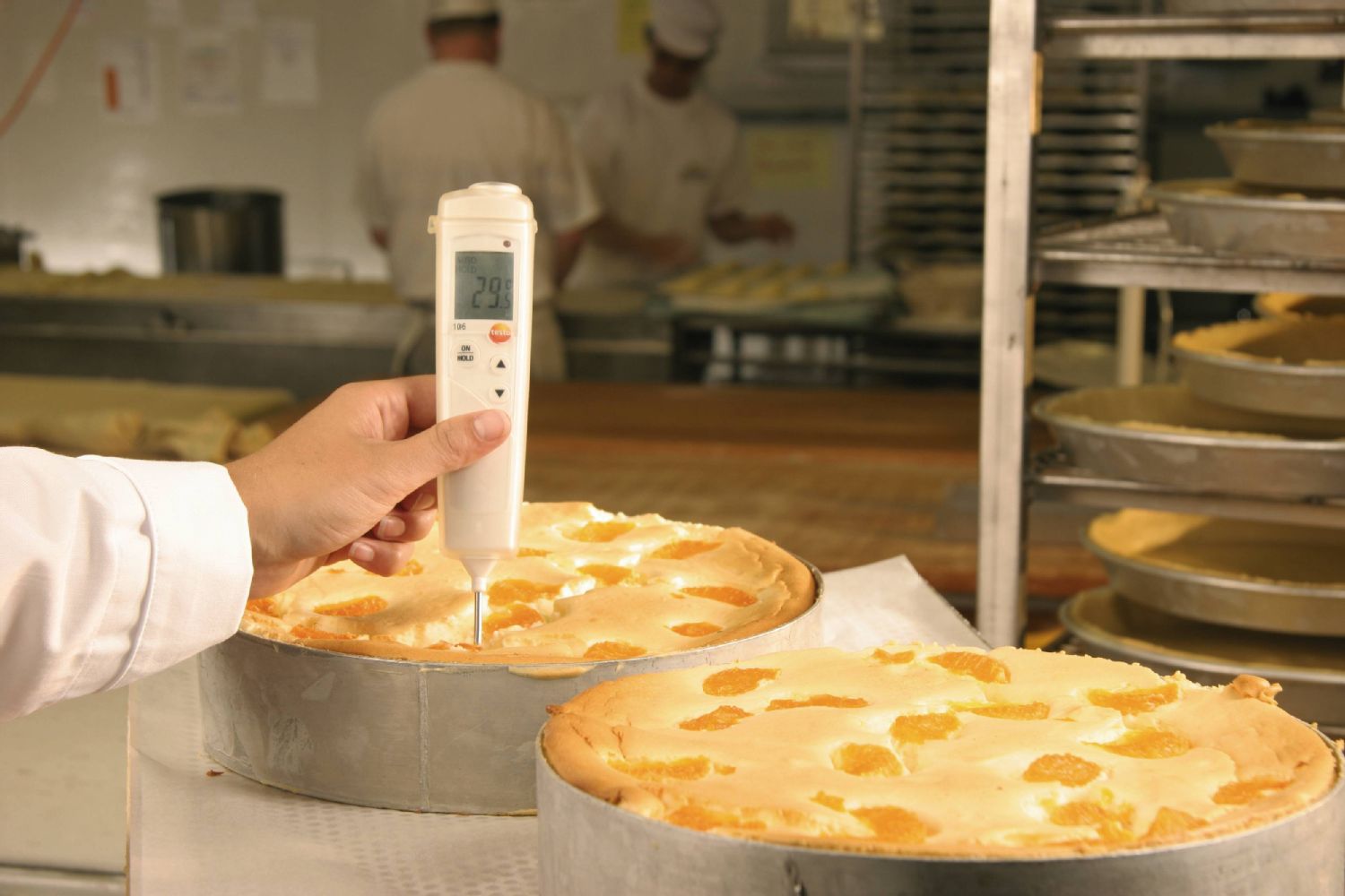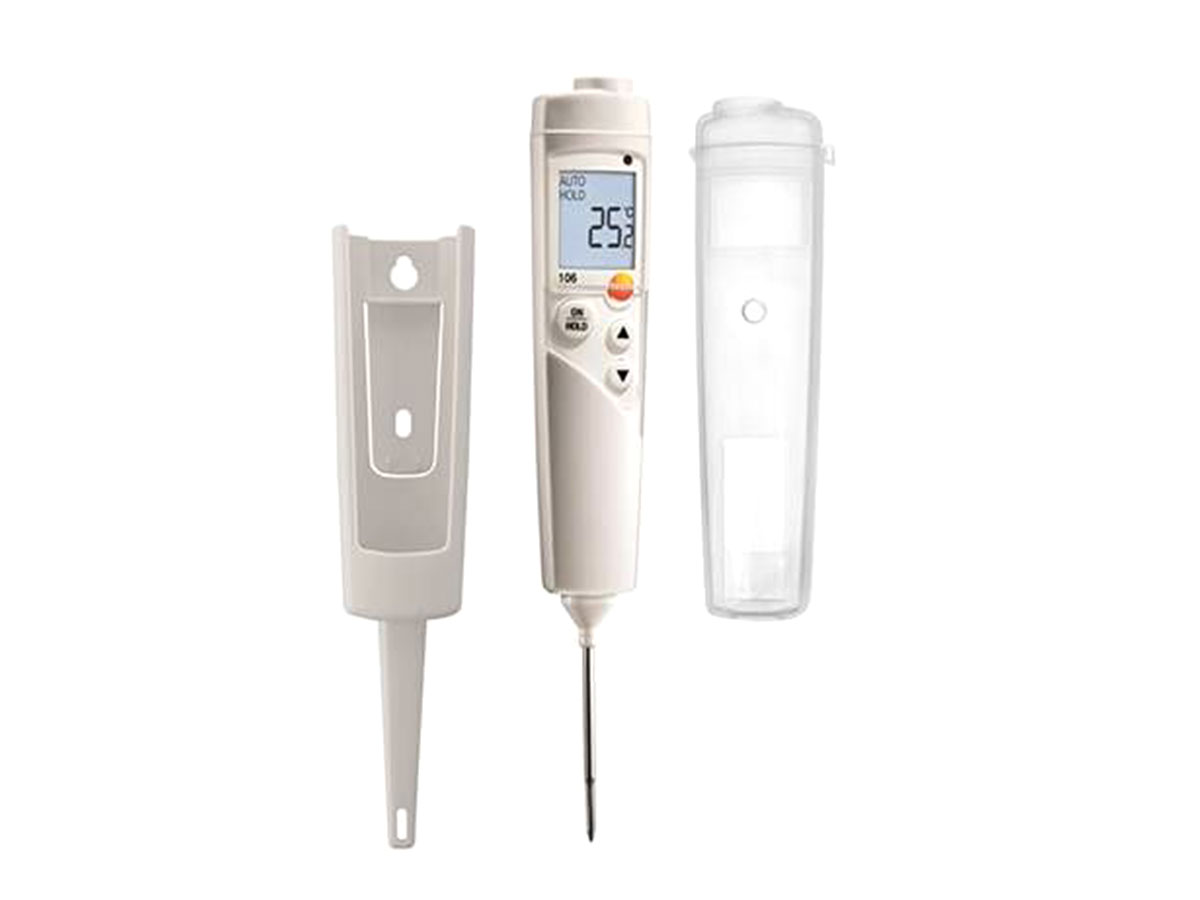 Термометр testo 106 с пищевым зондом отвечает требованиям НАССР и идеален для быстрой проверки внутренней температуры различных продуктов.