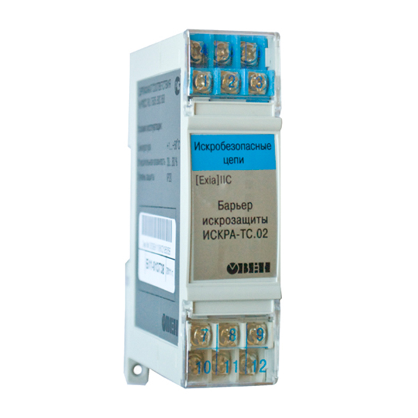 Барьер искрозащиты ОВЕН ИСКРА устанавливается в электрической цепи, связывающей датчик, находящийся во взрывоопасной зоне, и вторичный преобразователь (прибор), расположенный во взрывобезопасной зоне. Барьер обеспечивает искрозащиту электрической цепи датчика путем ограничения значений напряжения и тока до искробезопасных.