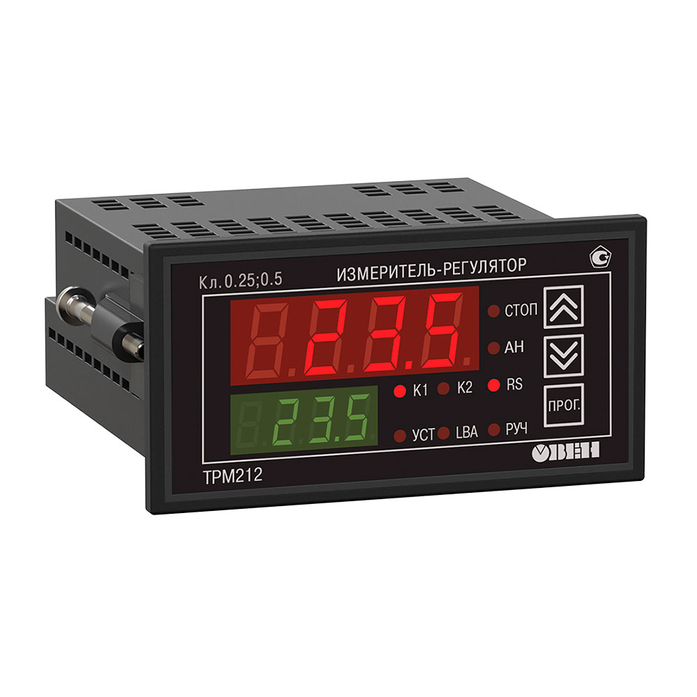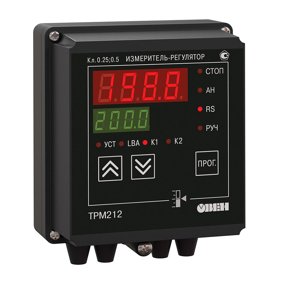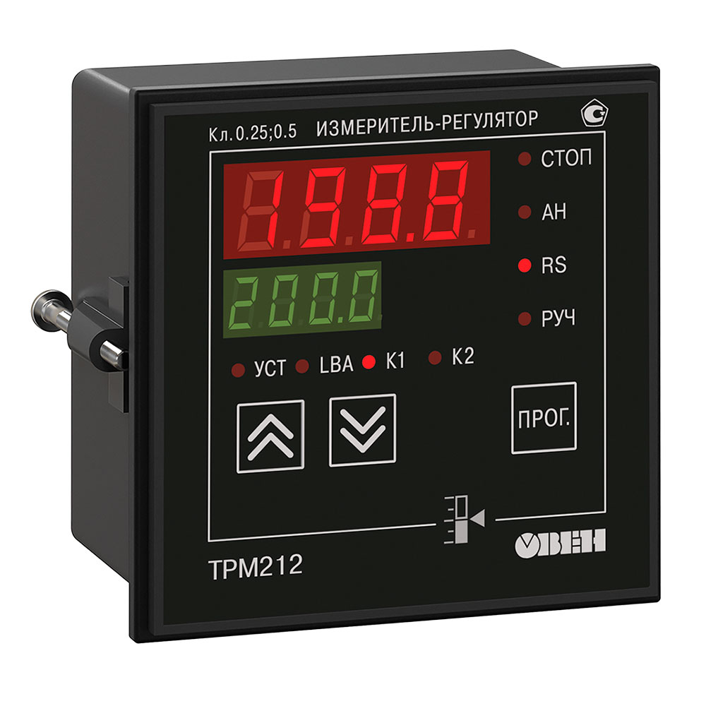 Терморегулятор ОВЕН ТРМ212 контролирует нахождение регулируемой величины в заданных пределах. Прибор выдает аварийный сигнал в одном из следующих случаев, когда значение измеренной величины: