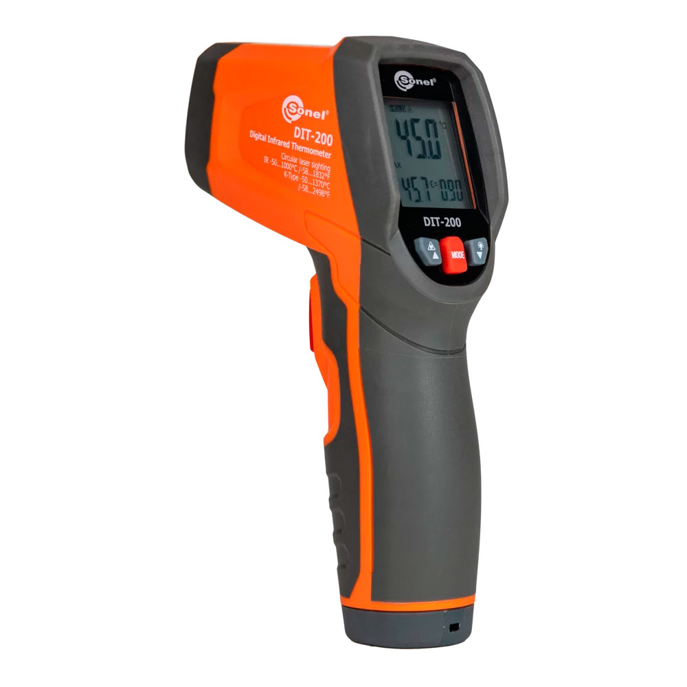 Sonel DIT-200 – инфракрасный измеритель температуры (пирометр). Современный прибор, позволяющий бесконтактным методом измерить температуру поверхности любых объектов: электронные компоненты, пластик, металл, дорожные покрытия, пластик, дерево, легко воспламеняемые объекты.