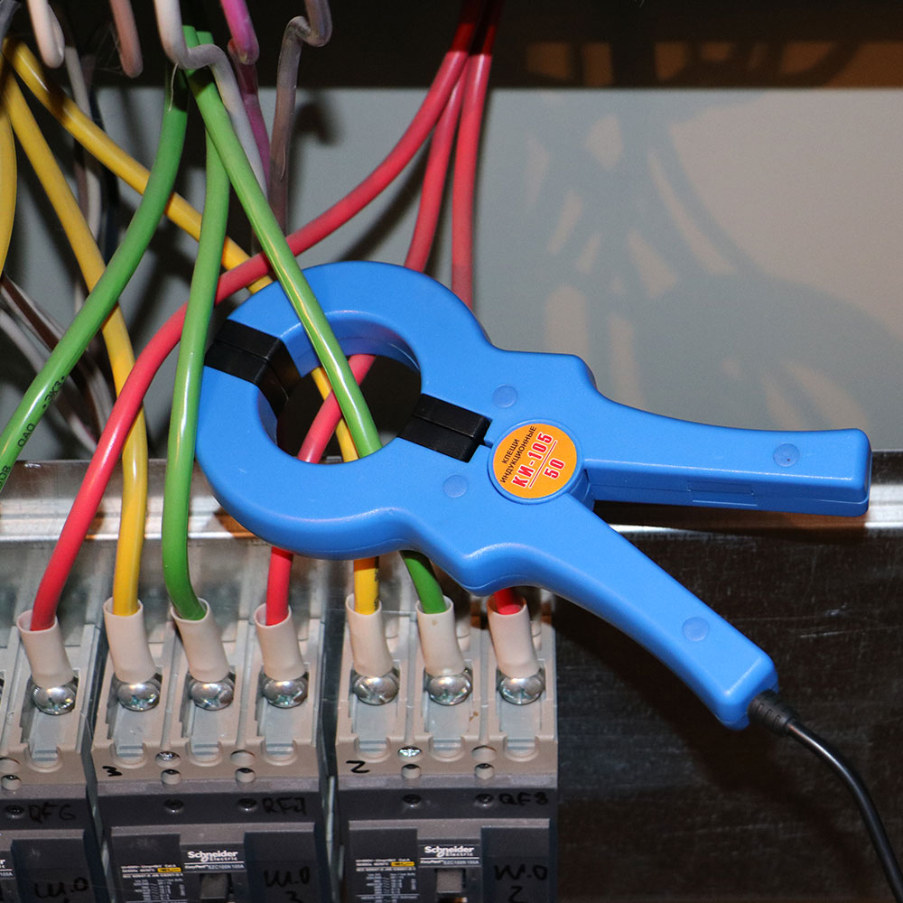 - Обхватить до смыкания полуколец индукционными клещами кабель.
