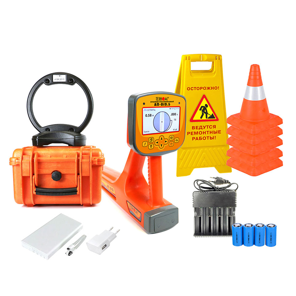 В составе комплекта приемник в виде моноблока с цветным ЖК дисплеем, на который выводится изображение трассы и в автоматическом режиме происходит расчет глубины залегания коммуникации до 30 м, а также величины тока в линии и самый мощный мультичастотный генератор в линейке ТЕХНО-АС, с дальностью работы до 10 км.