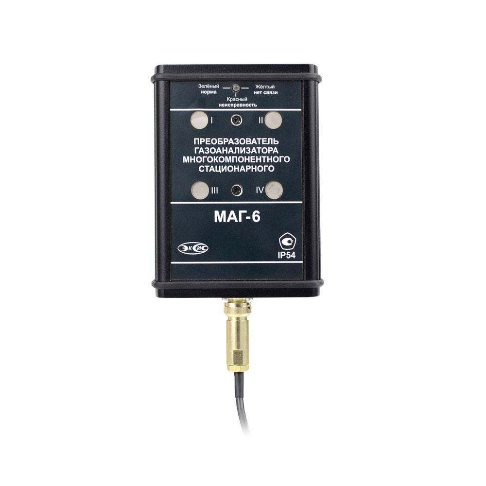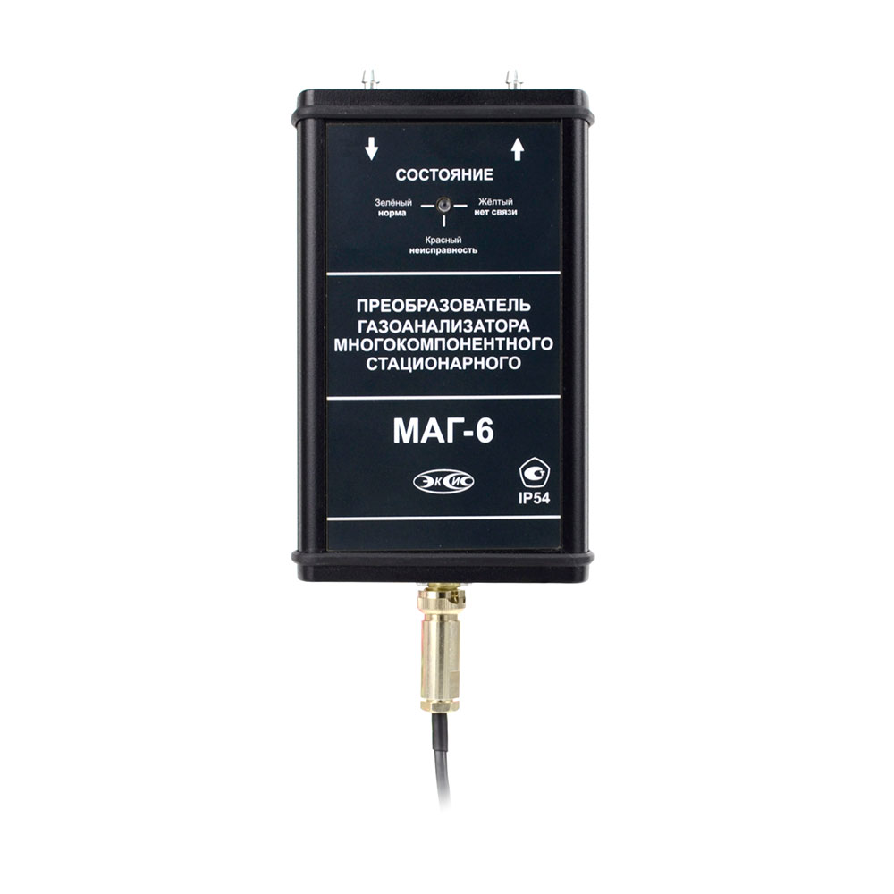 МАГ-6-Щ-X - стационарный 1-канальный (МАГ-6 Щ-1, МАГ-6 Щ-1-В) или 2-канальный (МАГ-6 Щ-2, МАГ-6 Щ-2-В) газоанализатор в щитовом исполнении корпуса, состоящий из блока измерений и первичных преобразователей, соединяемых с блоком измерения удлинительными кабелями длиной до 10 м. Используется для контроля объёмной доли О2, СО2, СН4, массовой концентрации СО, NH3, H2S, SO2, NO2 в воздухе рабочей зоны (любые 4 газа из 8 для каждого измерительного датчика).