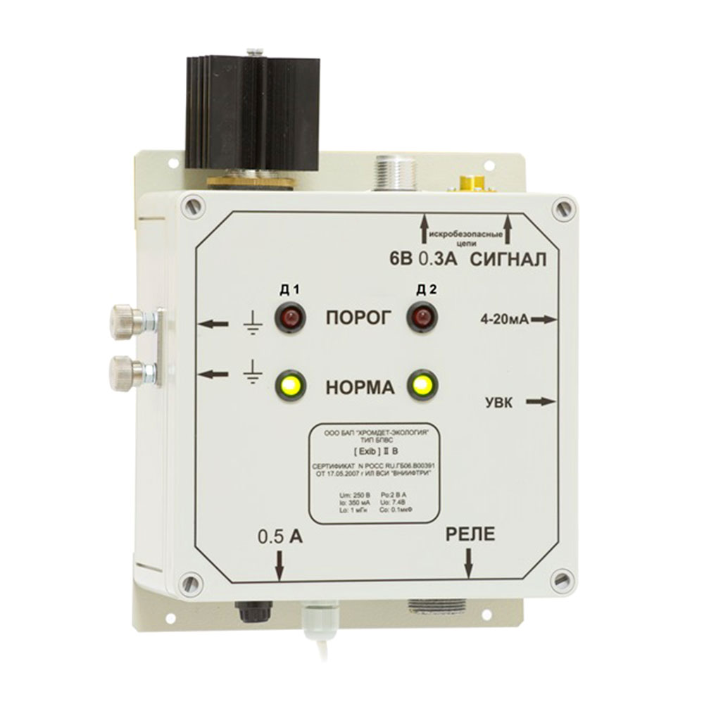 Газоанализатор выпускается во взрывозащищенном исполнении для применения во взрывоопасных зонах, где по условиям эксплуатации возможно образование взрывоопасных смесей категорий IIA, IIB,температурных групп Т1 – Т4, имеет маркировку взрывозащиты 1Ex ib IIB T4 Gb. БИ устанавливается во взрывоопасной зоне. БПВС размещается вне взрывоопасной зоны и имеет маркировку взрывозащиты [Ex ib Gb] IIB.