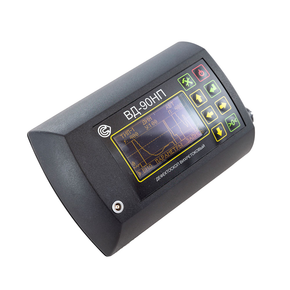 Прибор выполнен в малогабаритном корпусе, что обеспечивает его легкость, эргономичность и позволяет крепить его на поясе или на руке. Измерение выполняется с помощью выносного преобразователя, подключаемого гибким кабелем. Имеется несколько типов преобразователей для вихретоковой дефектоскопии изделий из различных материалов и различной геометрии. Большой и яркий PLED-дисплей отображает выбранные режимы работы и результаты измерений в текстовой и графической форме. ВД-90НП также характеризуют: