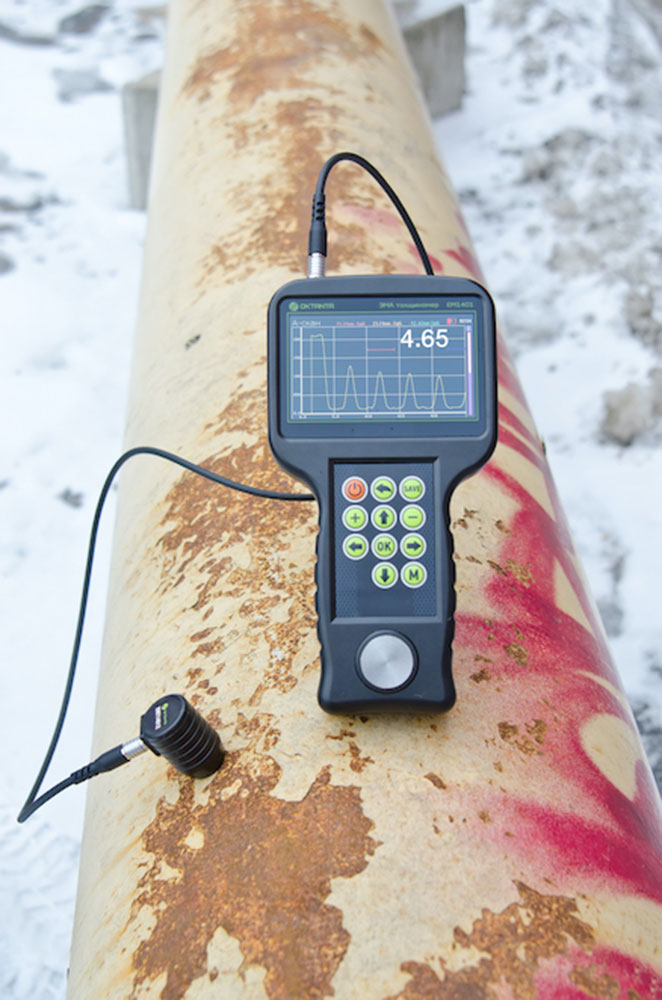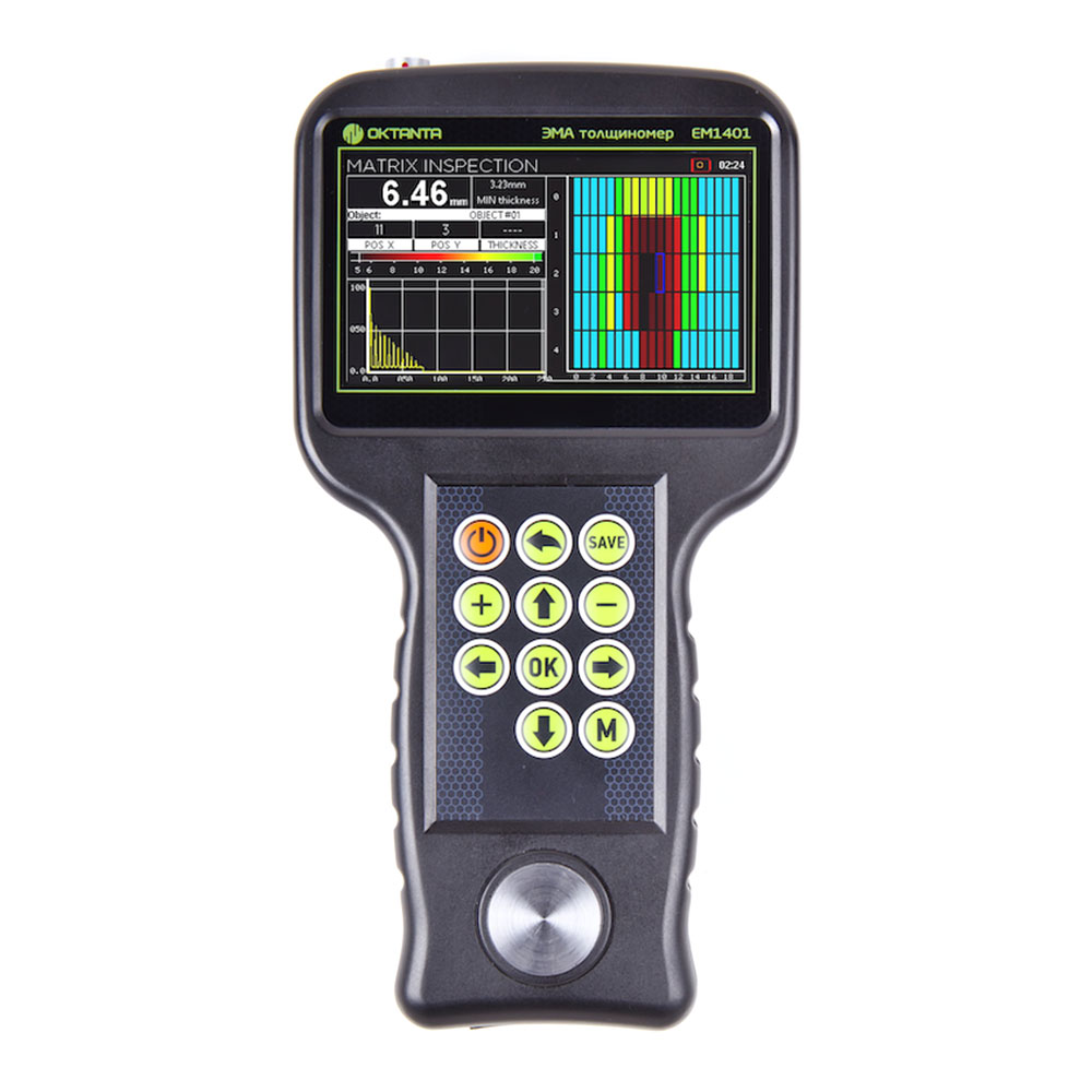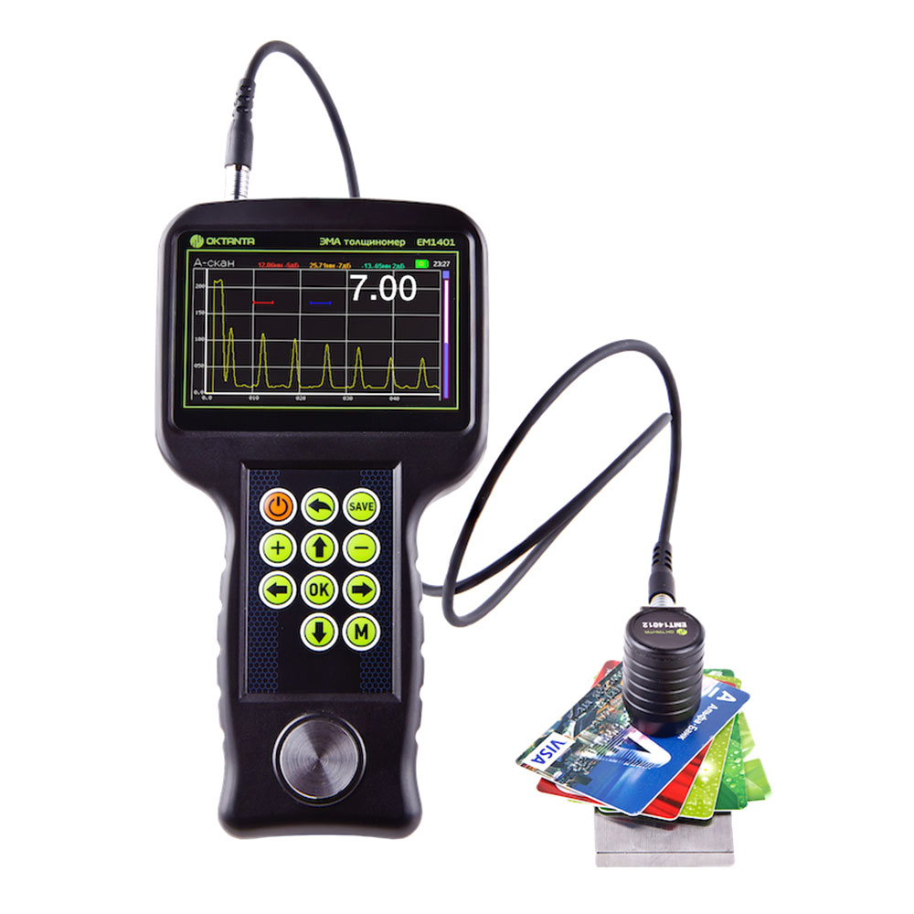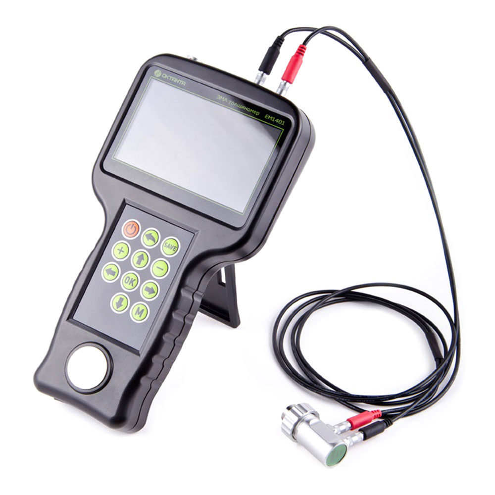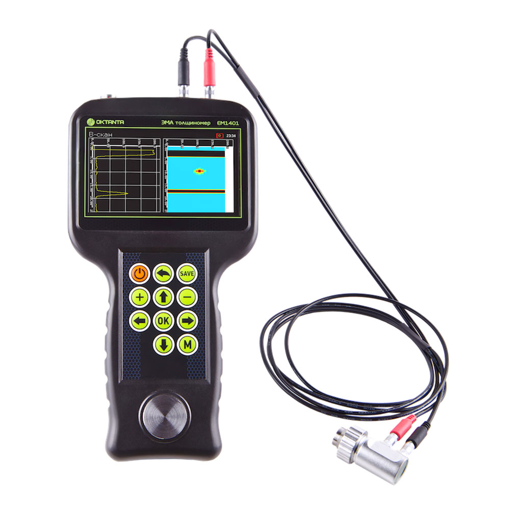 Толщиномер EM1401 UT имеет цветной дисплей, защищённый ударопрочным стеклом. Как и все ЭМА толщиномеры выпускаемые нашей компанией, толщиномер EM1401 UT использует специальный алгоритм обработки данных, который позволяет корректно измерять толщину в автоматическом режиме при наличии мешающих факторов, таких как анизотропия металла, наличие нескольких отражателей, наличие внешних помех. Помимо автоматического режима измерения толщины прибор позволяет использовать ручные режимы измерения по первому эхо-сигналу и по разности между любыми двумя эхо-сигналами. Ручной режим рекомендуется использовать на сильно корродированных объектах.