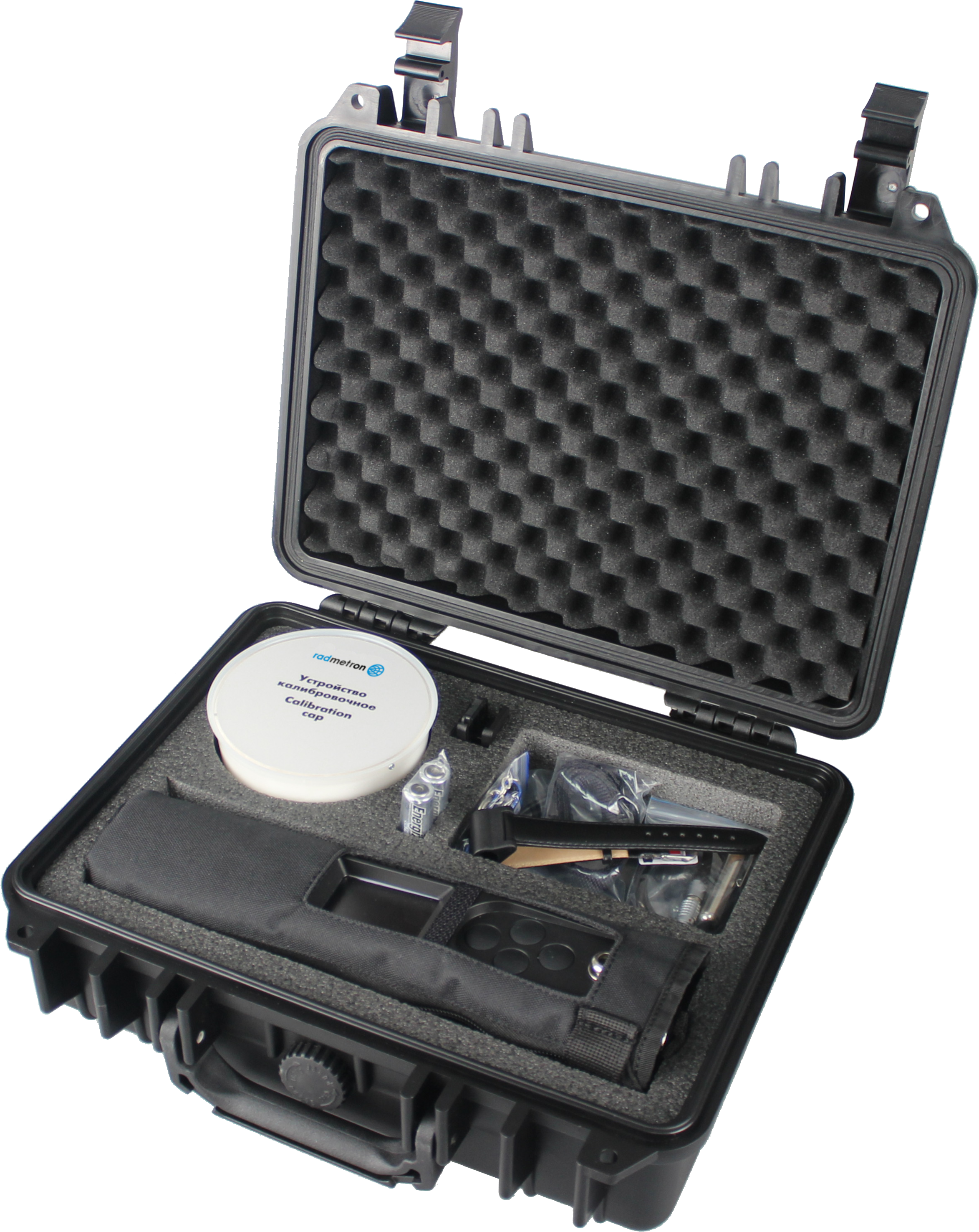 Внешний вибрационный сигнализатор (для работы в шумной обстановке либо для скрытого поиска), наручный ремешок для крепления внешнего вибрационного сигнализатора, камера-замедлитель, устройство калибровочное, удлинитель телескопический (для проведения обследования в труднодоступных местах), сосуд Маринелли (для измерения удельной активности изотопов радионуклида цезий-137 в жидкостях и сыпучих продуктах), штатив (для измерения удельной активности изотопов радионуклида цезий-137 в жидкостях и сыпучих продуктах)