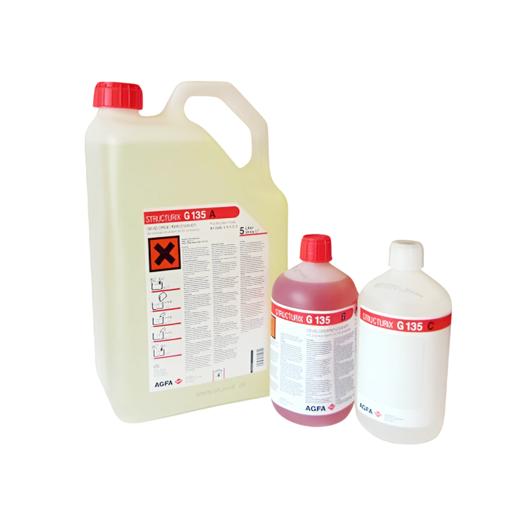 Проявитель Agfa Structurix G135 предназначен для автоматической обработки рентгеновских пленок. Проявитель G 135 поставляется в коробке, содержащей два одинаковых полукомлекта, каждый из которых состоит из трех компонентов (5 л компонента А, 0,5 л компонента В и 0,5 л компонента С). Каждый из полукомплектов может быть разведен до 20 литров рабочего раствора.