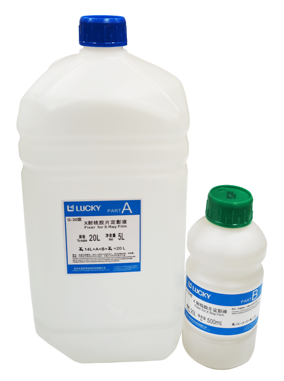 Упаковка фиксажа G30 включает два комплекта химикатов (канистра 5л компонента А и флакон 0,5 л компонента В) для приготовления 40 л готового рабочего раствора.