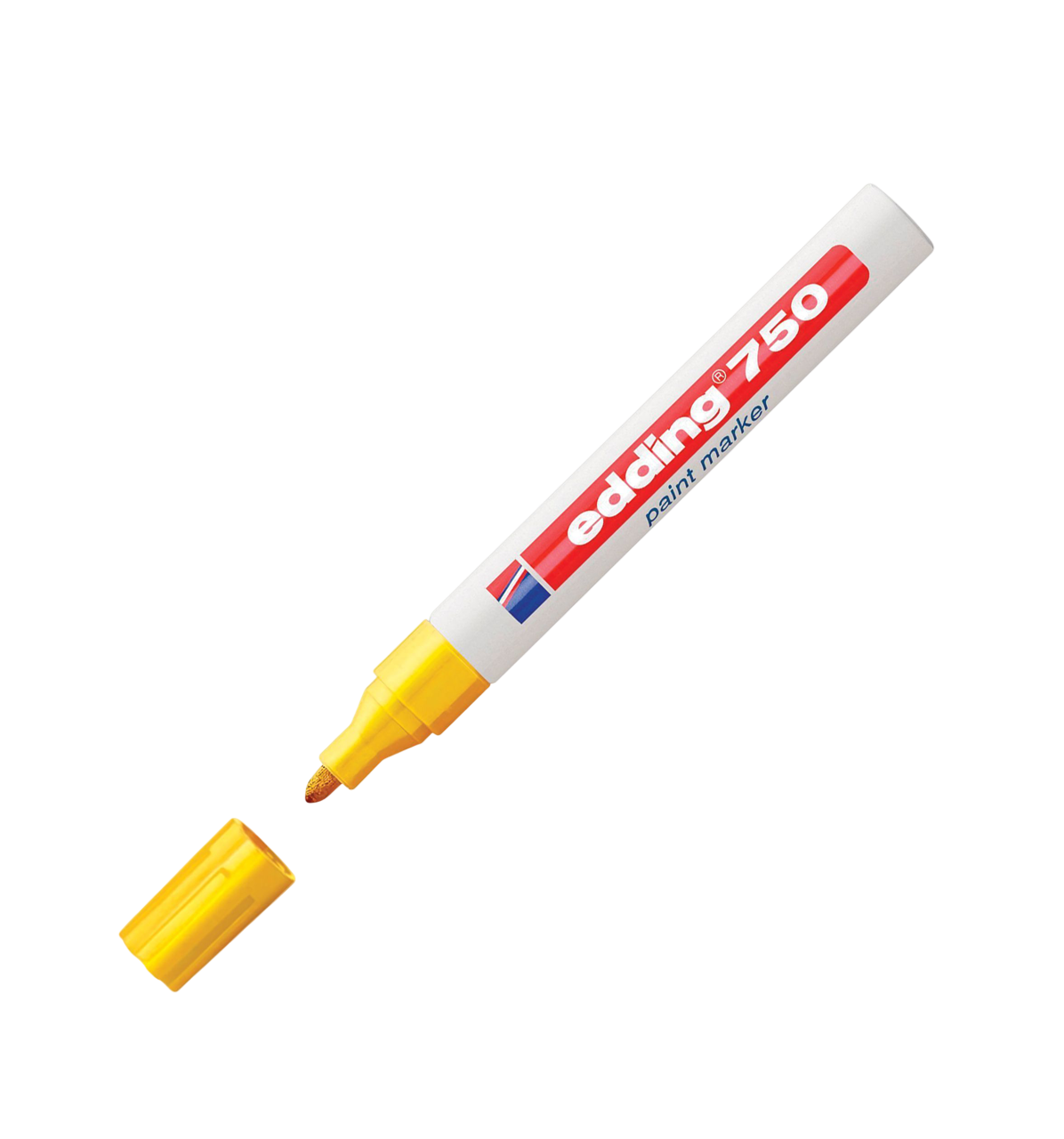 Универсальный маркер Edding 750, используется для промышленной непрозрачной маркировки практически всех материалов, например, стекла, пластика, дерева или металла. Может применяется для письма на жирных, пыльных, грязных поверхностях. Лаковый маркер устойчив к кислотам, растворителям, механическому истиранию, свету. Высококонцентрированный пигмент хорошо ложится на гладкие и шероховатые поверхности. Специальные добавки, введенные в состав маркера Edding E 750 растворяют, масляную пленку на поверхности письма. Непрозрачные лаковые чернила позволяют делать хорошо заметные надписи густым плотным слоем даже на темных поверхностях. Корпус промышленного маркера изготовлен из алюминия. Маркер Edding E 750 имеет упроченный круглый (пулевидный) наконечник. Наконечник маркера может быть заменен по мере истирания. Благодаря тонкому наконечнику, маркером может наноситься маркировка на небольшие элементы и поверхности. Толщина линии — 2-4 мм. Поток чернил регулируется клапаном. Чернила маркера с лакирующим эффектом на основе нитрокраски. Водостойкий, быстро сохнет. Термостойкость надписи до 1000 градусов по Цельсию. Надписи цветами 06-010, 049, 054 также видимы до 1000 С. Термостойкость остальных цветов — до 400 градусов по Цельсию. Маркер Edding E 750 хорошо зарекомендовал себя в работе при перепадах температур от −15 до 30. Промышленный лаковый маркер Edding Е-750 универсален. Используется, например, при нанесении меток на разнородные материалы. При маркировке изделий из резины, пластика, стекла, металла, кабеля, проводов, при нанесении маркировки на товары достаточно одного маркера — Edding E 750. Идеально подходит для маркировки грузов, приборостроения, технологической маркировки. Кроме того, маркер Edding E 750, благодаря разнообразной палитре цветов и свойствам красящего вещества, широко используется для декоративных и оформительских работ дизайнерами. используется в витражных работах, росписи по дереву и керамике, для других интерьерных работ. Инструкция по применению маркера: 1. Перед использованием хорошенько встряхнуть с закрытым колпачком. 2. Снимите колпачок, прижмите наконечник к поверхности, надавите и удерживайте пока не проступит краска. 3. Применять после того как убедитесь, что вытекает исходный цвет. Предостережение: плотно закрывайте колпачок после применения, держать маркер вдали от огня и прямых солнечных лучей.
