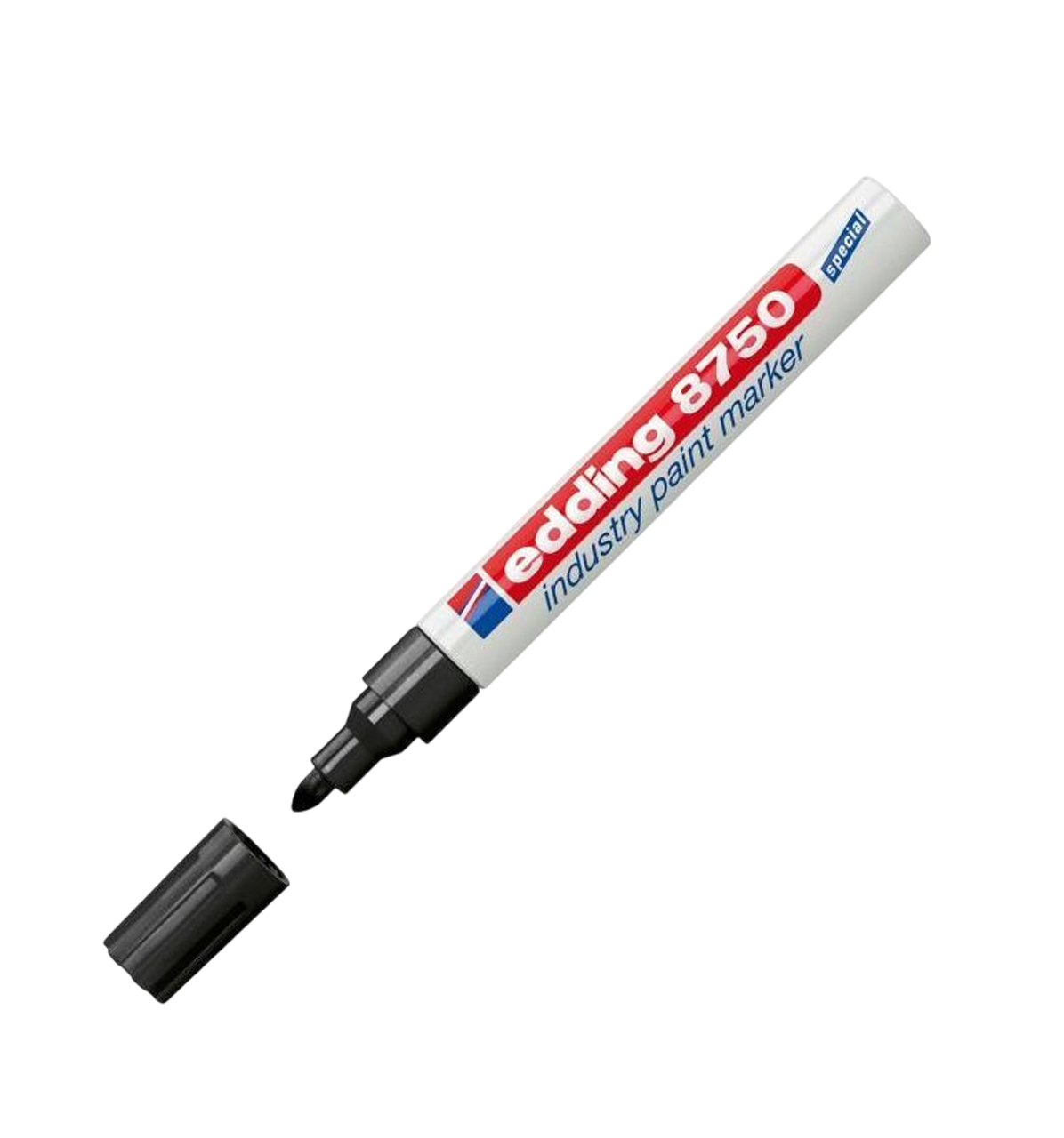 Промышленный лаковый маркер для промышленной, индустриальной графики, с пулевидным наконечником повышенной устойчивости к истиранию. Маркер универсален для нанесения маркировки и надписей в сложных, агрессивных промышленных условиях. Хорошо подходит для письма на грязных, жирных поверхностях. Выдерживает воздействие кислотами, растворителями, механическому воздействию. Стойкие чернила, ложатся густым плотным слоем с лаковым эффектом на гладкие и пористые поверхности. Надписи хорошо видно издалека на тёмных поверхностях. Специально разработанный состав маркера Edding 8750 растворяют масляную пленку на поверхности письма. Температурный режим краски маркера 1000 C. Максимальная температура поверхности при написании маркером не более 100 градусов по Цельсию. Толщина линии 2-4 мм.