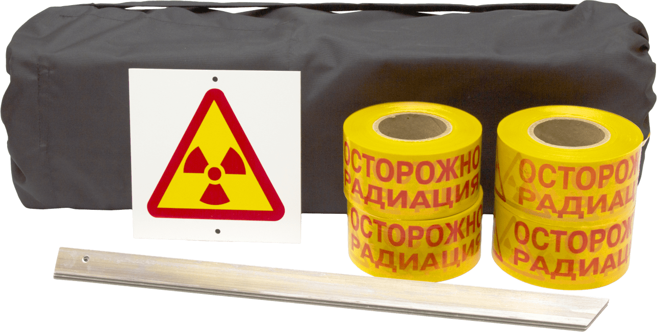 Правила проведения подобной операции предполагают ограждение зоны, в которой будут идти работы с использованием источников, распространяющих опасное излучение. Для этого в продаже имеется набор радиационная опасность. Он состоит из: