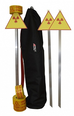 При проведении радиографического метода контроля с использованием источников ионизирующего излучения необходимо оградить место его проведения и прилегающую к нему зону. Для этого используют предостерегающие об опасности предметы, которые в совокупности образуют набор радиационной безопасности. Набор можно использовать как в полевых условиях, так и в цеховых. Набор радиационной безопасности состоит из 6 стоек с одним заостренным концом на каждой, 6 знаков с надписью «Радиационная опасность», 4 оградительные ленты по 250 м с надписью «Осторожно – радиация!», крепежа (болты – 12шт., гайки – 12шт.) и упаковочной сумки. Набор «Радиационная опасность» производства ООО «АЛЬФА-НДТ» соответствует требованиям ТУ 22.21.4-007-40323842-2017 , ГОСТ 17925-72 и имеет соответствующий паспорт.