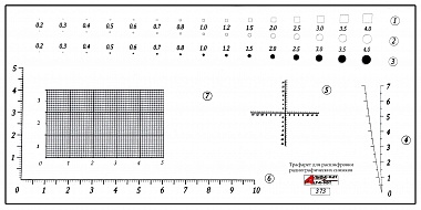 Трафарет является вспомогательным инструментом при расшифровке радиографических снимков сварных соединений и служит для оценки линейных размеров обнаруженных дефектов в соответствии с требованиями ГОСТ-7512-82, ГОСТ 23055-78, ПНАЭ Г-7-010-89, ПНАЭ Г-7-017-89 и других нормативных документов и оперативного обнаружения недопустимых дефектов.