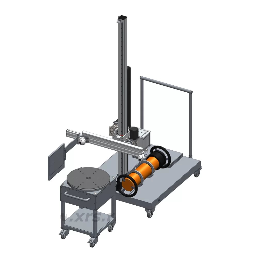 Опционально штатив может быть укомплектован автоматизированным поворотным столом для размещения и позиционирования объекта контроля. Кабель управления поворотным столом подключается к специальному разъёму, расположенному на торцевой части платформы штатива, управление поворотным столом осуществляется с единого дистанционного пульта.
