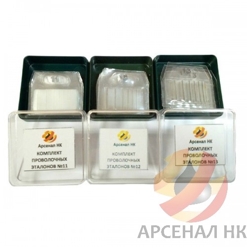 Каждый эталон состоит из семи параллельных проволок различного диаметра, длиною 20 мм. Предельные отклонения диаметра проволок от установленной стандартом величины составляют: при толщине до 0,2мм ± 0,01мм; от 0,2 до 1,6 мм ±0,03мм; от 1,6 до 4,0мм ±0,04мм. Проволочные эталоны поверке не подлежат, но должны изыматься из обращения при любом повреждении пластикового чехла или обнаружения следов коррозии проволок. Фотографии эталонов и диаметр проволок приведены в следующей таблице.