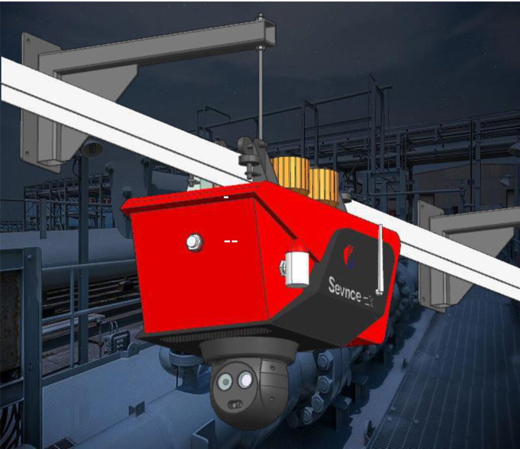Робот передвигается по направляющей, может проводить мониторинг на большой высоте, в узких проемах или шахтах. «Тело» робота может наклоняться, поворачиваться для полного обзора.