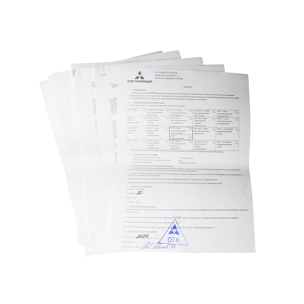 Комплект образцов СПЛАВ предназначен для входного контроля и сравнительного анализа, в том числе для проверки работоспособности структуроскопов. Образцы могут быть применены для сравнения при определении марки металла и сплава исследуемого объекта по средствам сравнения с использованием структуроскопов Метэк.