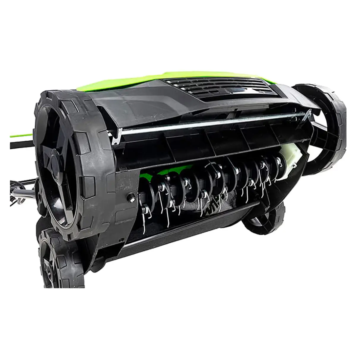 Аэратор аккумуляторный Greenworks GDT15 1600W — это мощное устройство, которое имеет 1600-ваттный двигатель и скорость вращения вала 3200 оборотов в минуту. Он оснащен двумя заменяемыми насадками — со спицами и с ножами. Спицы вала прокалывают почву, что позволяет кислороду и воде проникать к корневой системе травы. Ножи, в свою очередь, надрезают корни травы, что стимулирует их рост и укрепляет их структуру.
