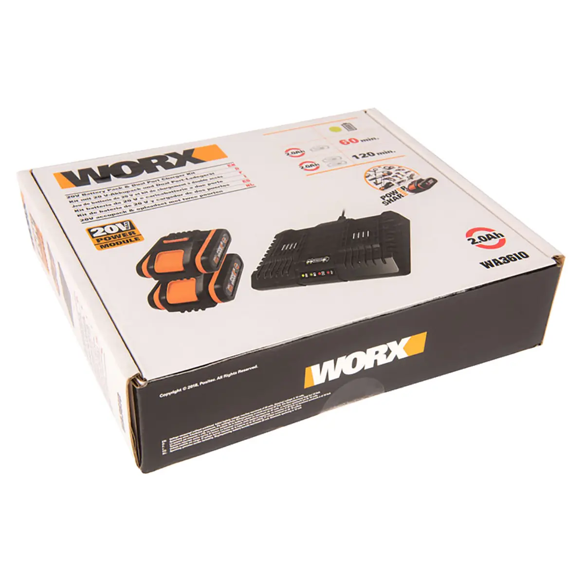 WA3610 – это универсальный комплект для всех аккумуляторных инструментов WORX в линейке вольтажа 20 В. Комплект состоит из двух литий-ионных батарей Powershare 2 Ач и двойного зарядного устройства WA3772.
