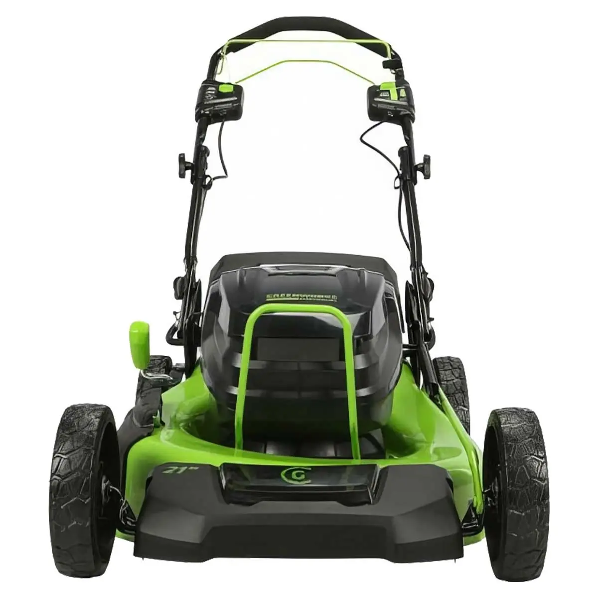 Аккумуляторная газонокосилка Greenworks GC82LM51SP2 бесщеточная, 82V с АКБ 2.5 Ач, без ЗУ – высокопроизводительный самоходный инструмент профессионального класса с 51-сантиметровым режущим элементом, который позволяет выполнять кошение травы на требуемой высоте со сбором обрезков в 60-литровый травосборник, боковым выбросом или мульчированием. В отличие от моделей без привода на задние колеса, эта газонокосилка оборудуется двумя слотами под 82-вольтовые аккумуляторы и поддерживает функцию Switchover, благодаря которой после разряда одной батареи питание автоматически переключается на вторую, обеспечивая увеличение продолжительности непрерывной работы.