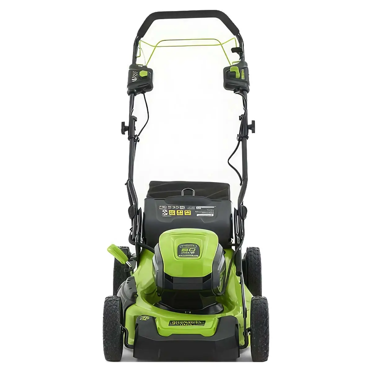Для улучшения проходимости и маневренности задние (приводные) колеса газонокосилки выполнены в большем размере, чем передние. Скорость движения Greenworks GD60LM46SP бесщеточная, 60V без АКБ и ЗУ может изменяться с помощью переключателя с левой стороны ручки, позволяя выбирать оптимальный режим хода в зависимости от условий местности.