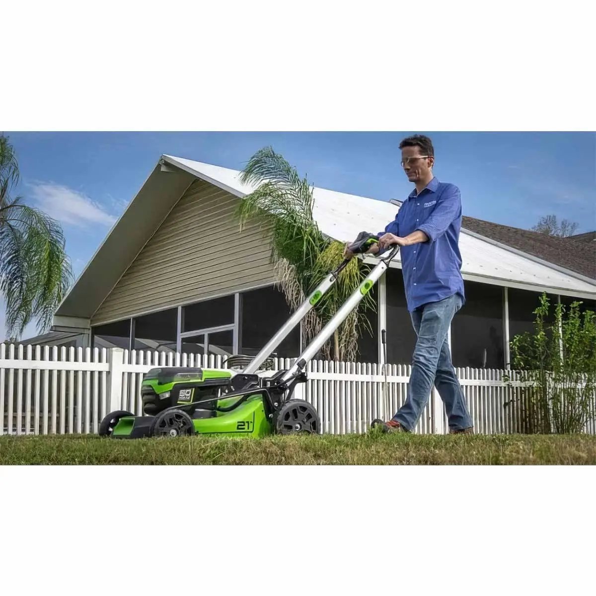 От ранее выпускавшихся моделей с рабочим напряжением 60 В модификация Greenworks GD60LM51SP бесщеточная, 60V с АКБ 2 Ач + ЗУ 2А отличается полностью переработанной эргономикой. С целью снижения веса складывающаяся ручка с прямоугольным сечением изготовлена из алюминиевого сплава. Изменение ее положения выполняется при разблокировке подпружиненных фиксаторов, для чего не нужно наклоняться к силовому блоку. "Лепестковые" рычаги запуска косильного механизма и привода колес продублированы, что позволяет управлять оборудованием любой рукой. Косилка может перемещаться без включения привода ножей, что делает ее доставку к месту проведения работ более безопасной.