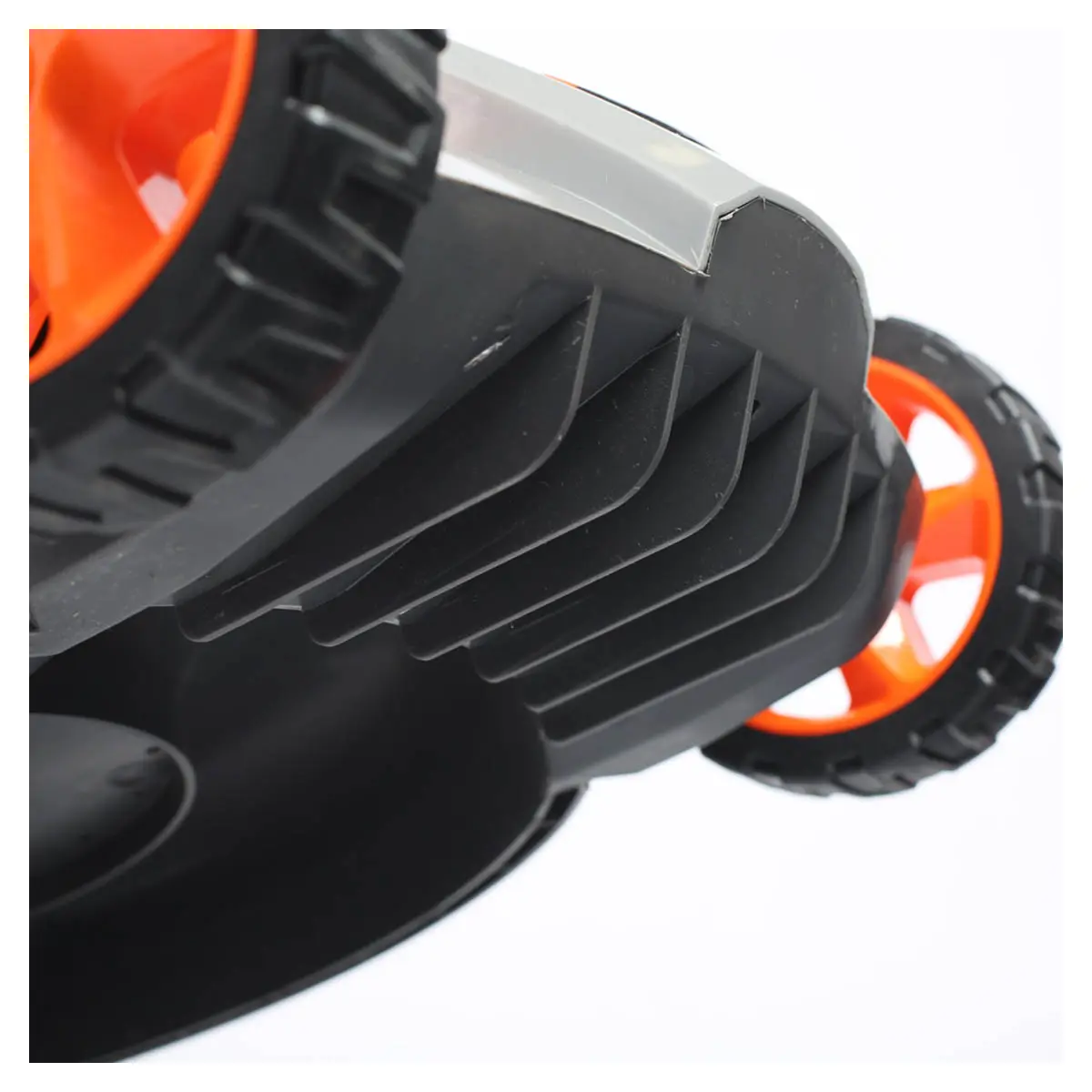 Одно из главных преимуществ газонокосилки - ее хорошая маневренность. Задние колеса больше передних, что обеспечивает высокую подвижность. Благодаря выраженному рисунку протектора, инструмент легко преодолевает неровности на участке.
