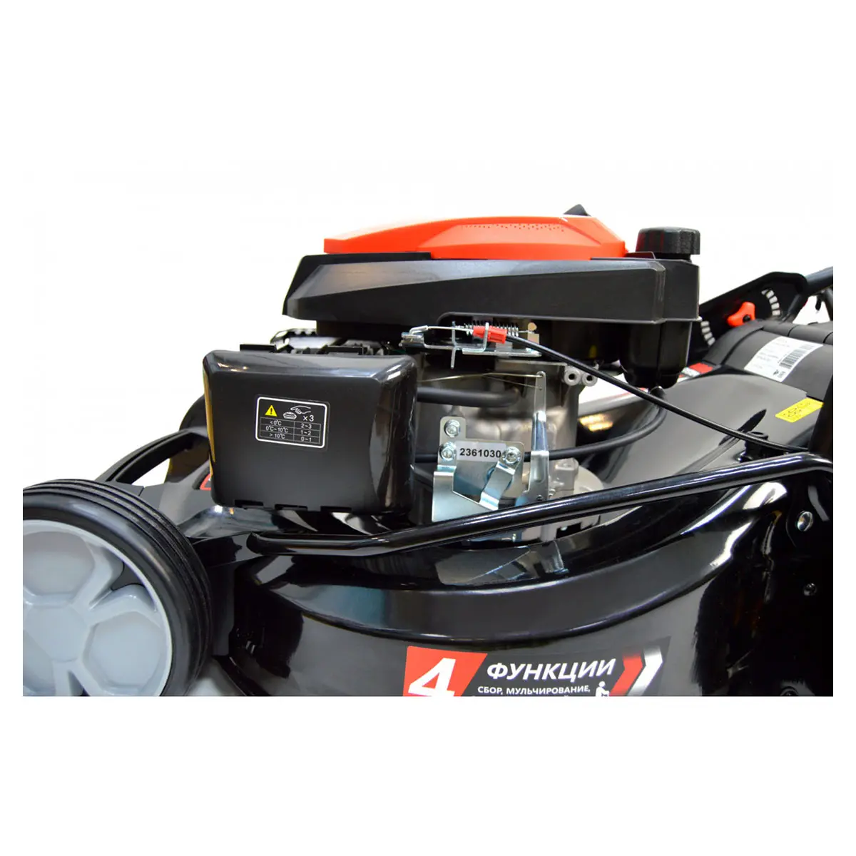 Корпус газонокосилки выполнен из прочного металла, он защищает двигатель от внешнего воздействия – механических повреждений и загрязнений. Техника оборудована четырехтактным двигателем, работающим на бензине АИ 92. Мощность мотора – 4,0 кВт, обеспечивающая эффективное скашивание травы разной жесткости. Ножи выполнены из высокопрочной стали. Ширина среза за один проход – 520 мм, высота – от 25 до 70 мм. Есть 7 уровней регулирования высоты скашивания, что делает уход за газоном более эффективным.