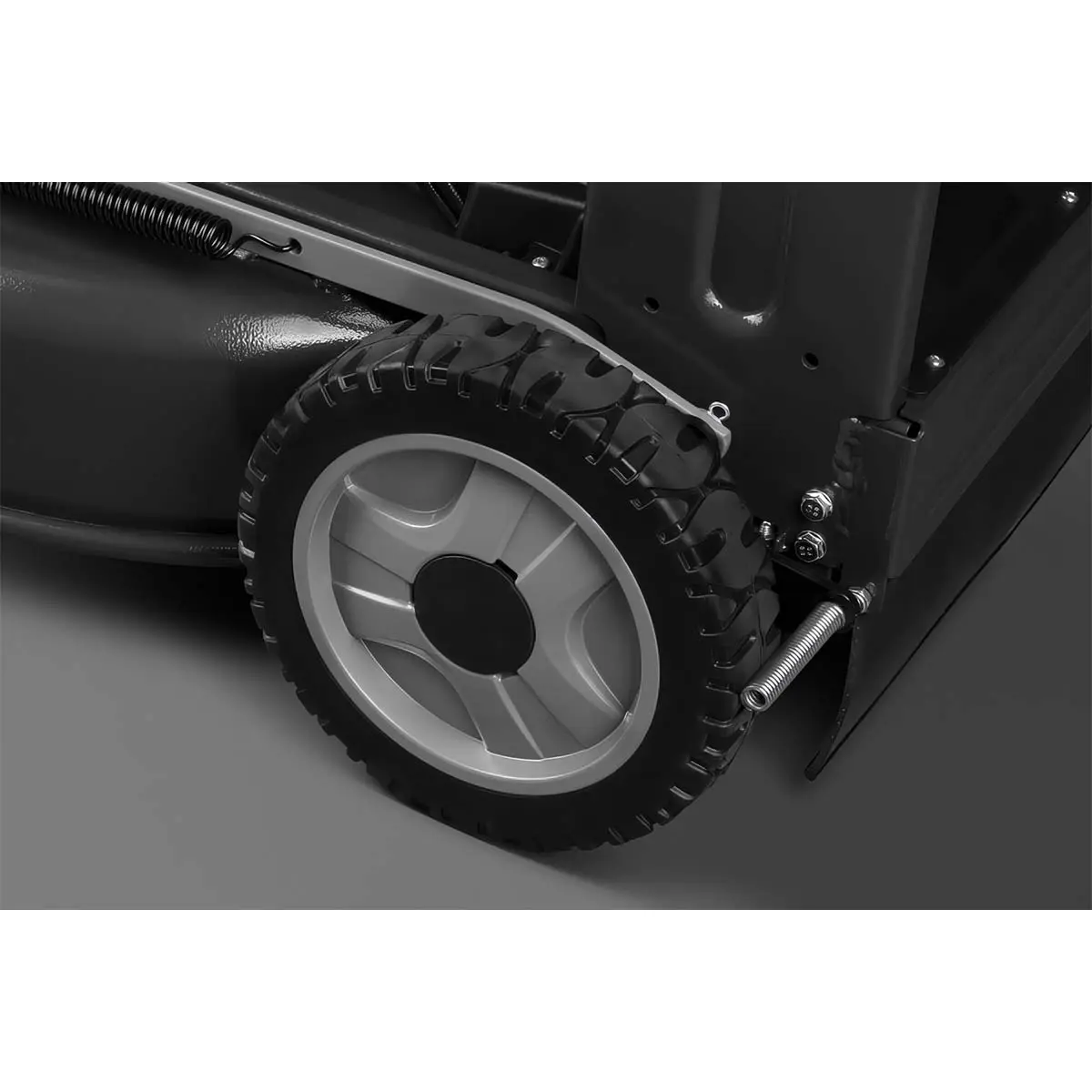 Колеса оснащены стальными пружинными скребками, которые не только удаляют траву с протектора, но и обеспечивают скашивание кромок. Это позволяет достичь более ровного и аккуратного результата.