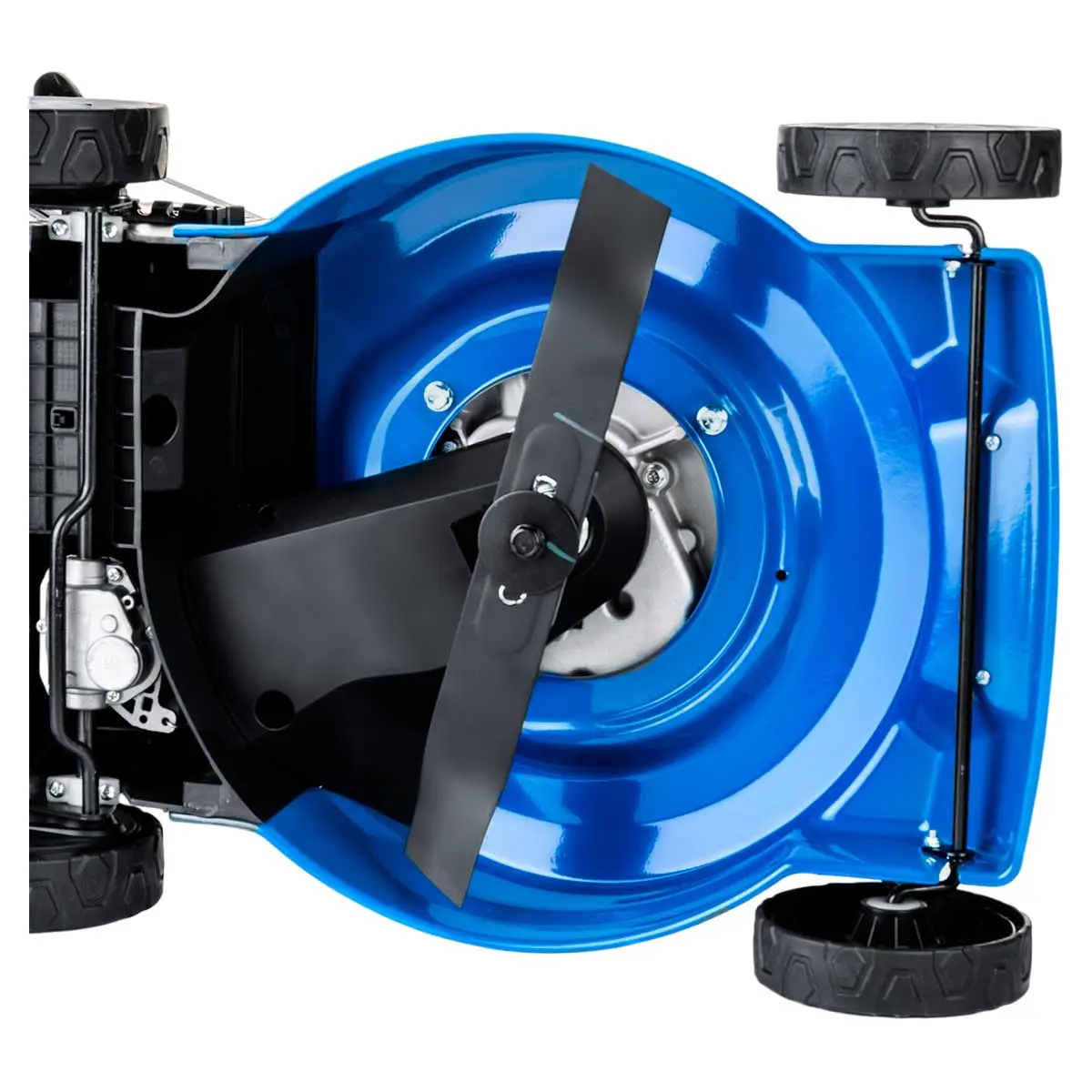 - Двухлопастной аэро-нож особой формы создает воздушный вихрь, приподнимающий и расправляющий траву для равномерного скашивания.