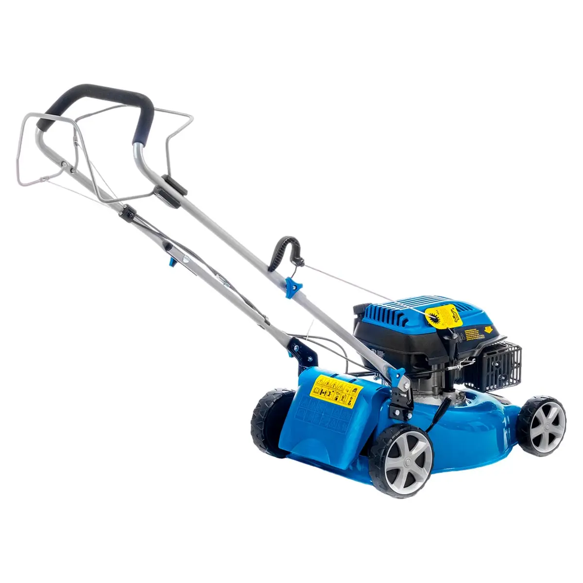 Бензиновая газонокосилка Hyundai L 4310S оборудована режущим механизмом с 4 лопастями, которые защищены от столкновения с твердыми предметами. Высоту кошения можно регулировать в диапазоне 25-75 мм, причем для этого не требуется переставлять колеса - достаточно изменить положение центрального рычага.