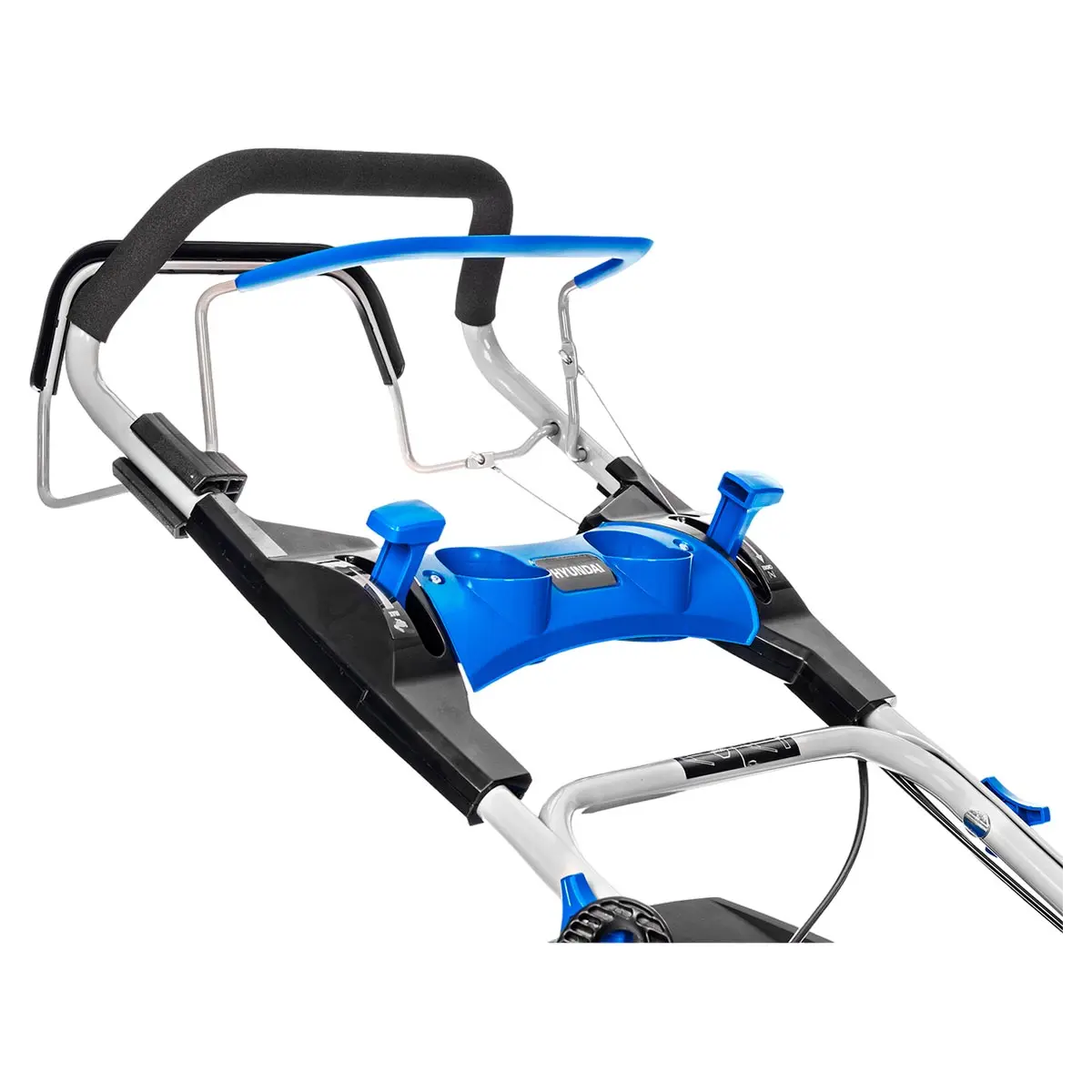 Рукоятка управления снабжена резиновый вставкой для надежного хвата и оснащена панелью с подстаканниками. При работе высоту ручки можно настроить под рост пользователя, а после завершения покоса ее можно сложить для снижения габаритов техники при хранении.
