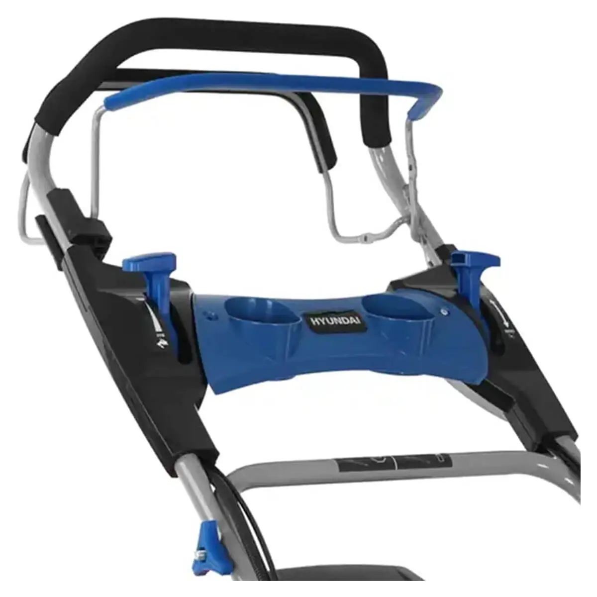 Рукоятка управления снабжена резиновый вставкой для надежного хвата и оснащена панелью с подстаканниками. При работе высоту ручки можно настроить под рост пользователя, а после завершения покоса ее можно сложить для снижения габаритов техники при хранении.