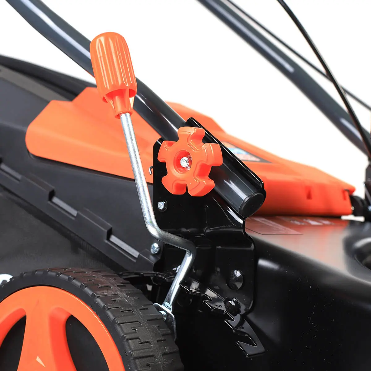 Благодаря приводу на задние колеса, косилка сама едет, и вам не нужно толкать ее. Все рычаги управления выведены на основную рукоять, так что остановить машину можно в одно мгновение. Кроме того, высоту ручки можно скорректировать под свой рост для большего удобства.