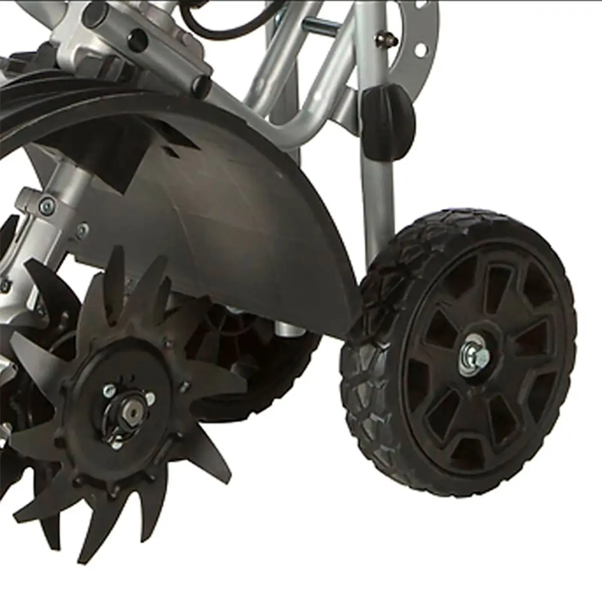 Удобная велосипедная рукоятка с резиновыми накладками обеспечивает полный контроль над инструментом. Аппарат также оснащен пластиковыми колесами диаметром 20 см, позволяющими регулировать их положение по высоте или даже полностью демонтировать при необходимости.