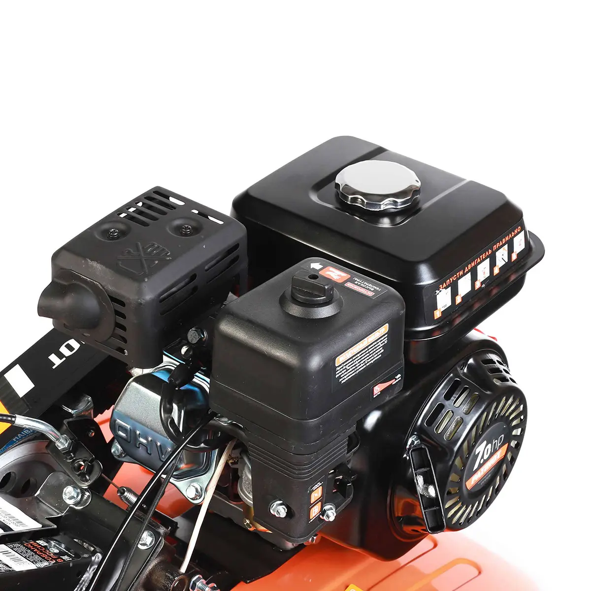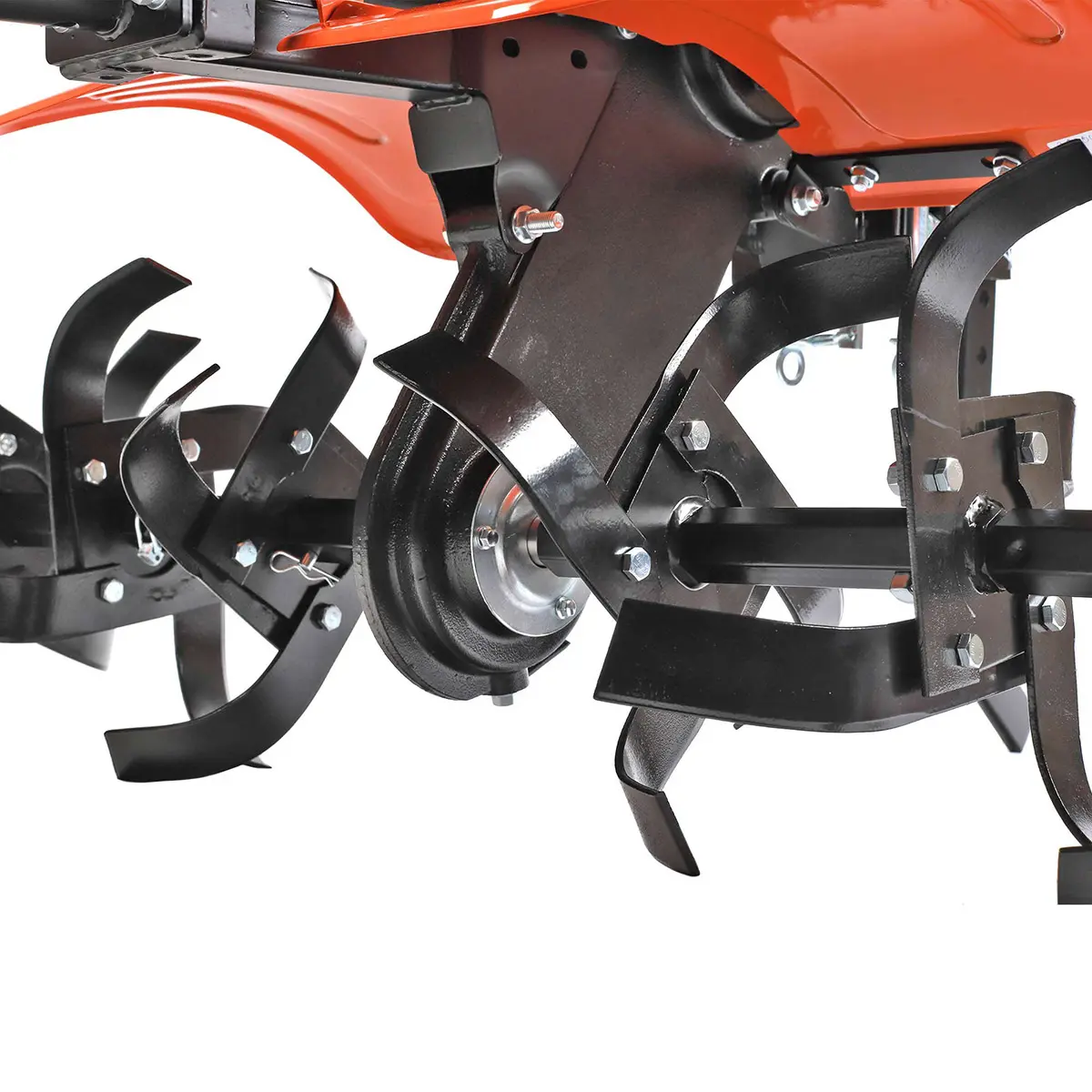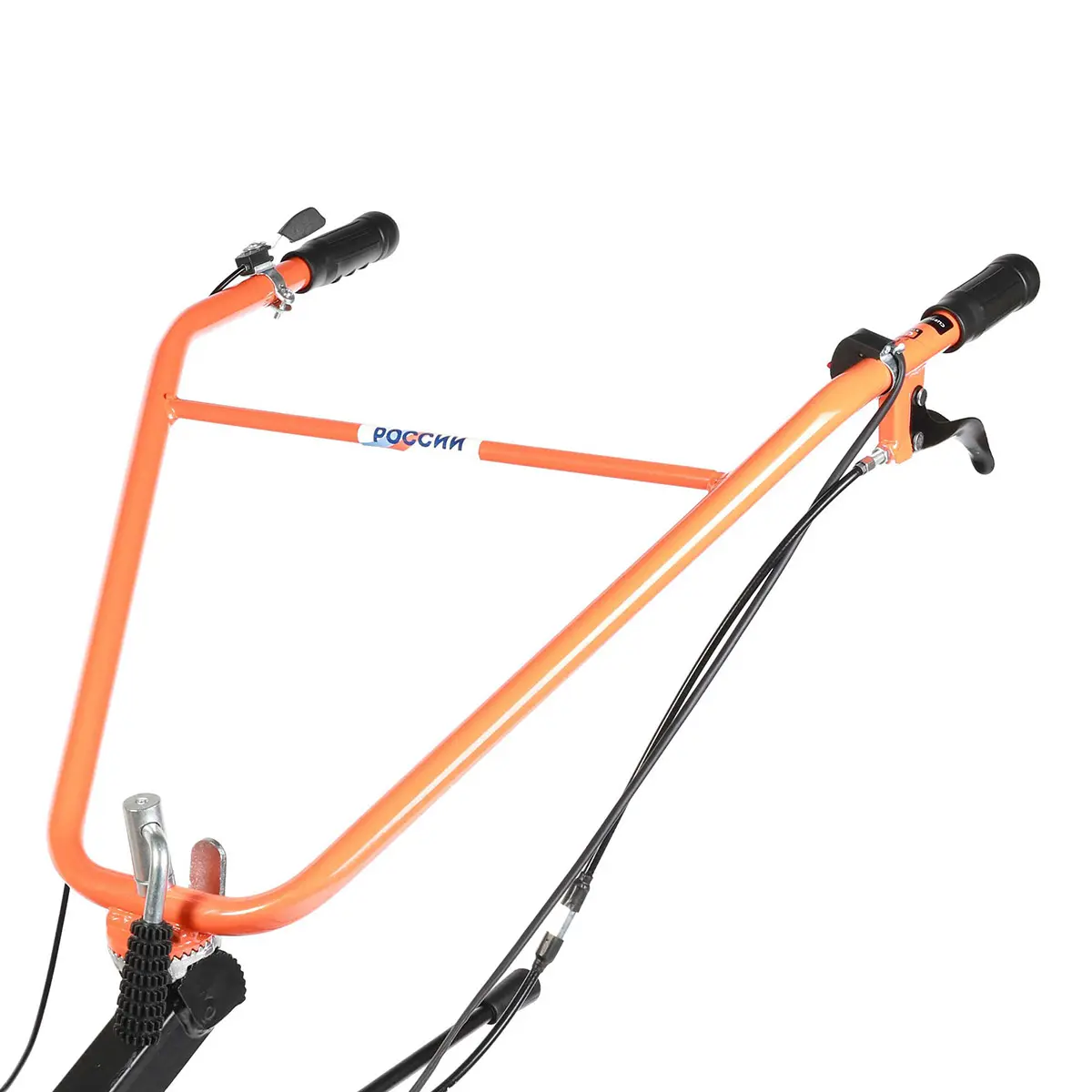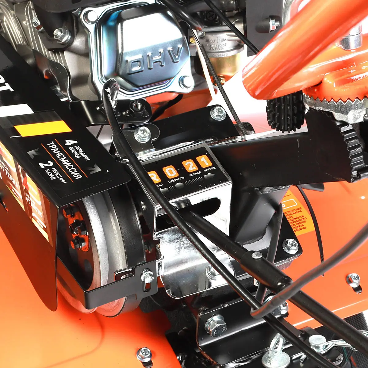 Для большего удобства в использовании агрегат оснащен 4 скоростями вперед и 2 назад. Это позволяет подобрать оптимальный режим работы для различных условий и темпа движения. Все органы управления удобно расположены на рукоятках, что исключает необходимость отвлекаться от обработки почвы. Широкая горловина топливного бака облегчает заправку.