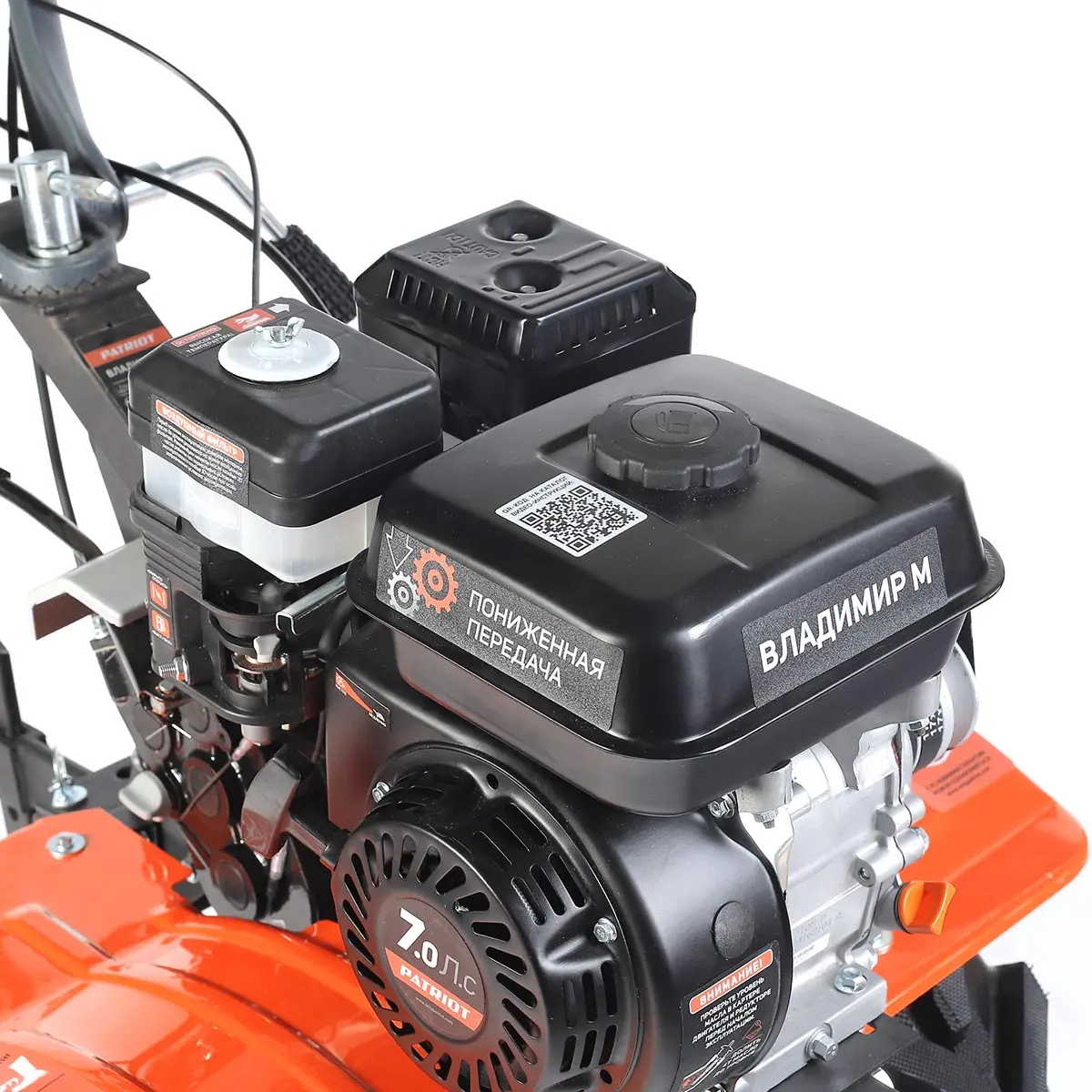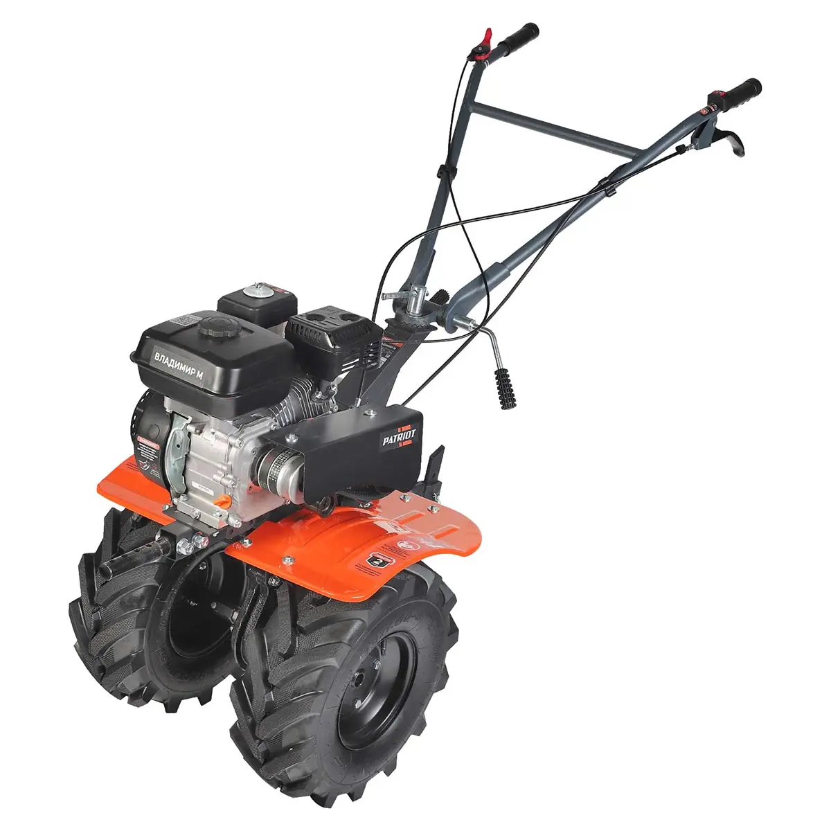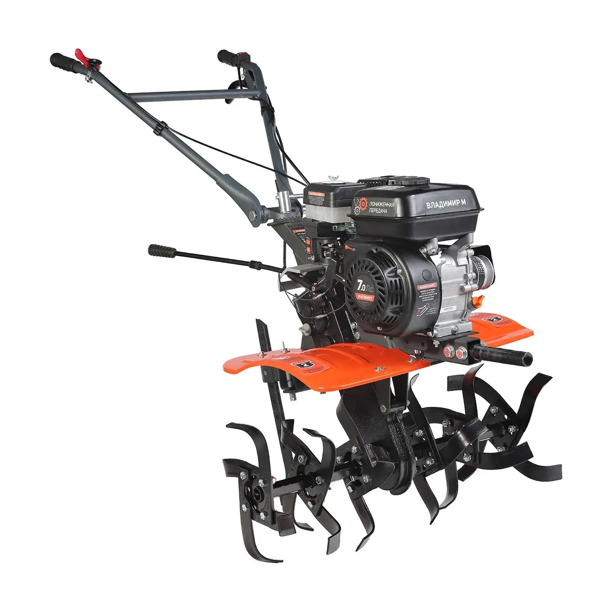 На руле расположены кнопка включения, рукоятка газа и рычаг привода фрез, что позволяет легко управлять техникой. Рычаг трансмиссии позволяет выбрать нужную скорость и направление движения мотоблока Patriot Владимир М, обеспечивая максимальную гибкость и маневренность при работе.