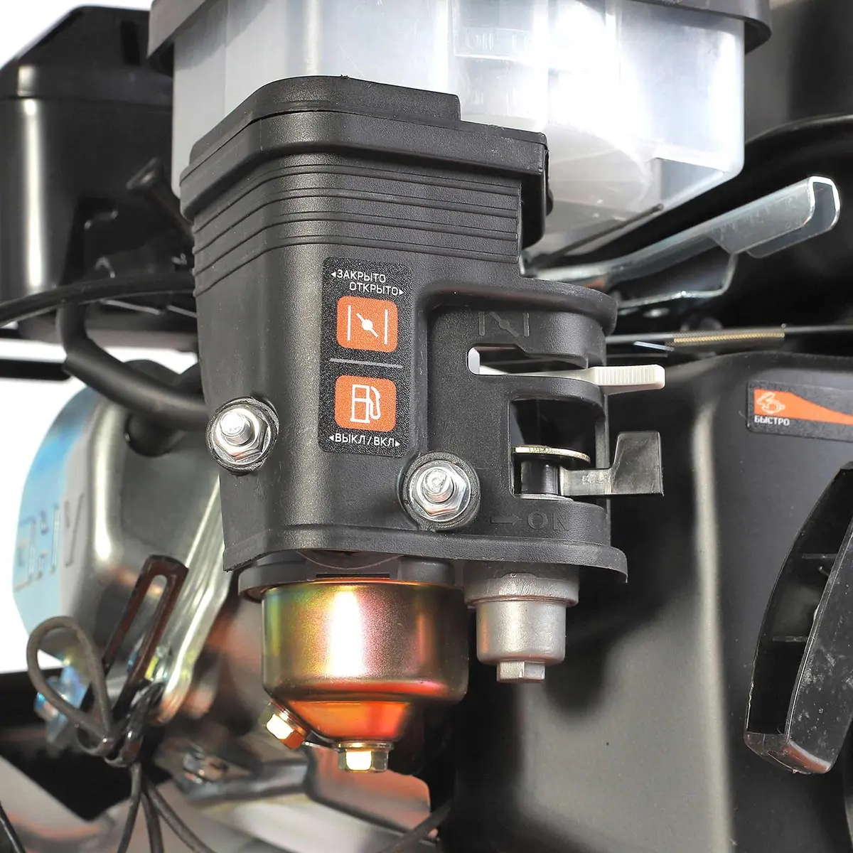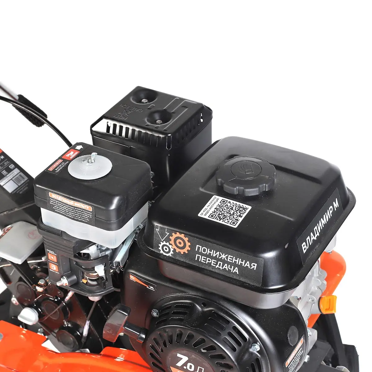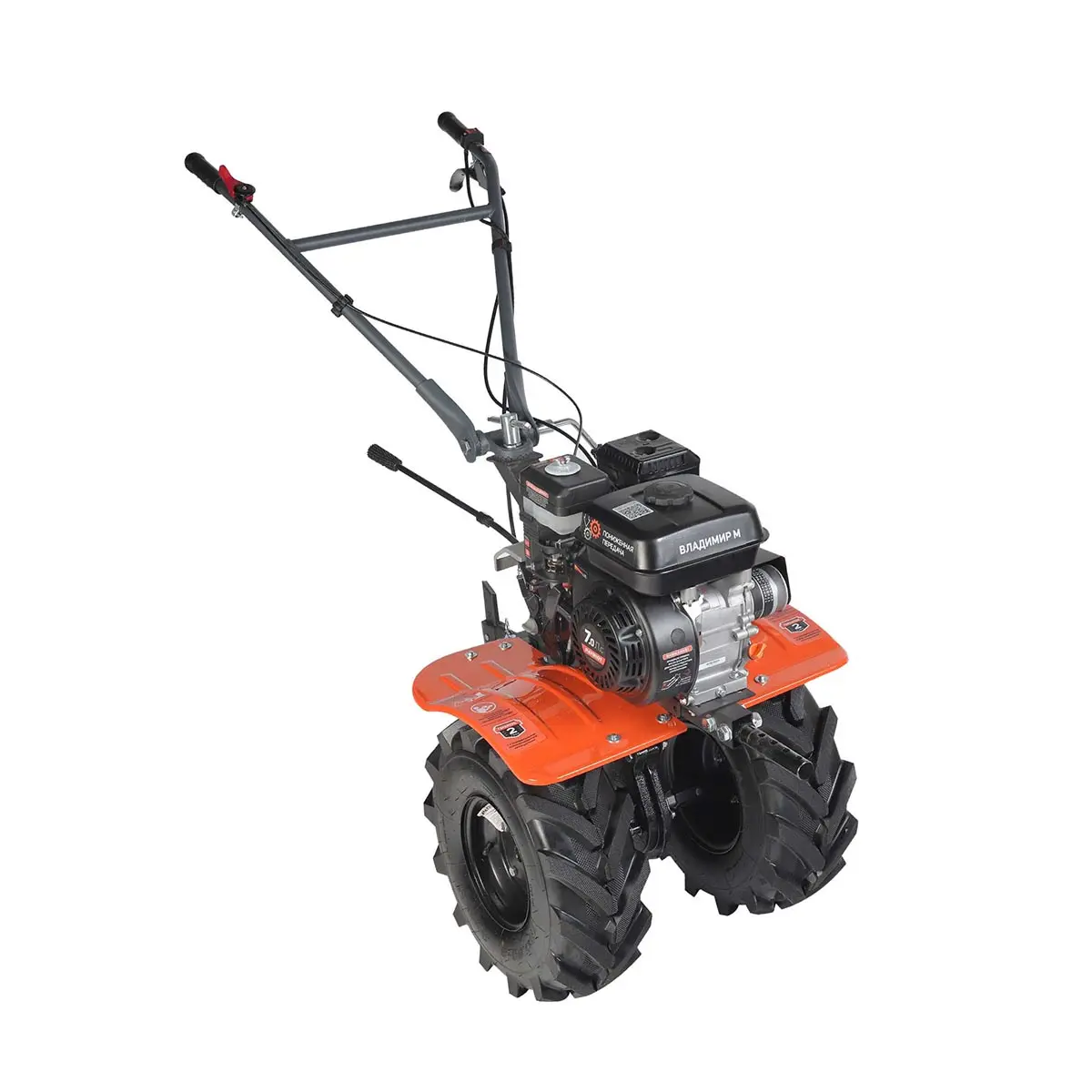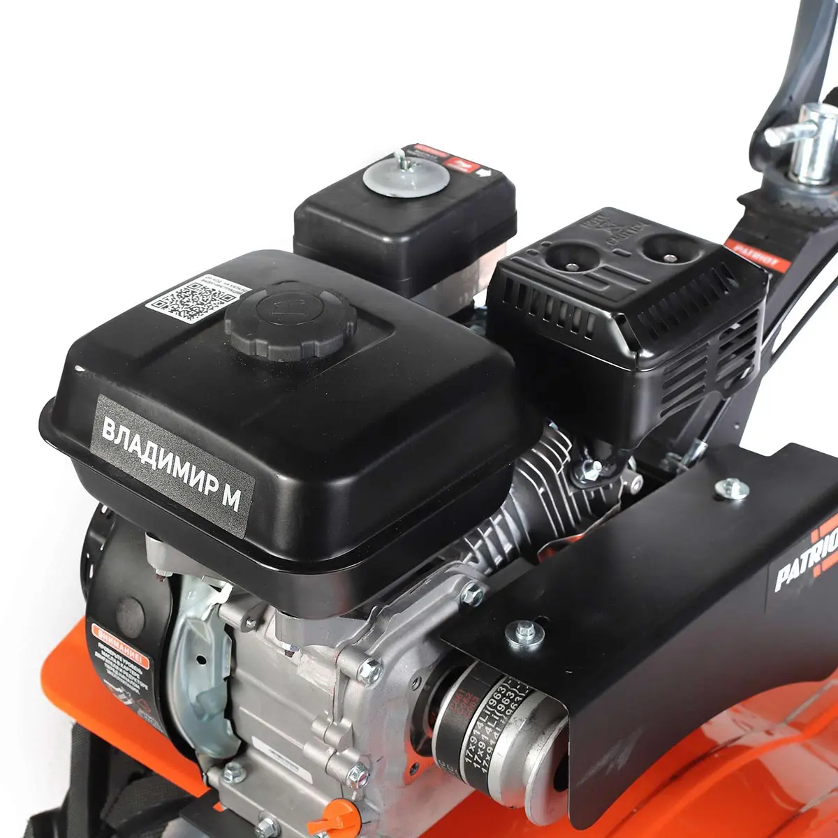 На руле расположены кнопка включения, рукоятка газа и рычаг привода фрез, что позволяет легко управлять техникой. Рычаг трансмиссии позволяет выбрать нужную скорость и направление движения мотоблока Patriot Владимир М, обеспечивая максимальную гибкость и маневренность при работе.