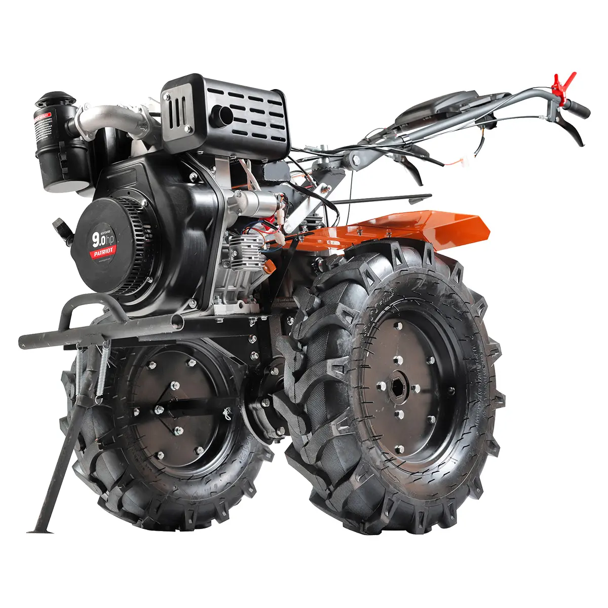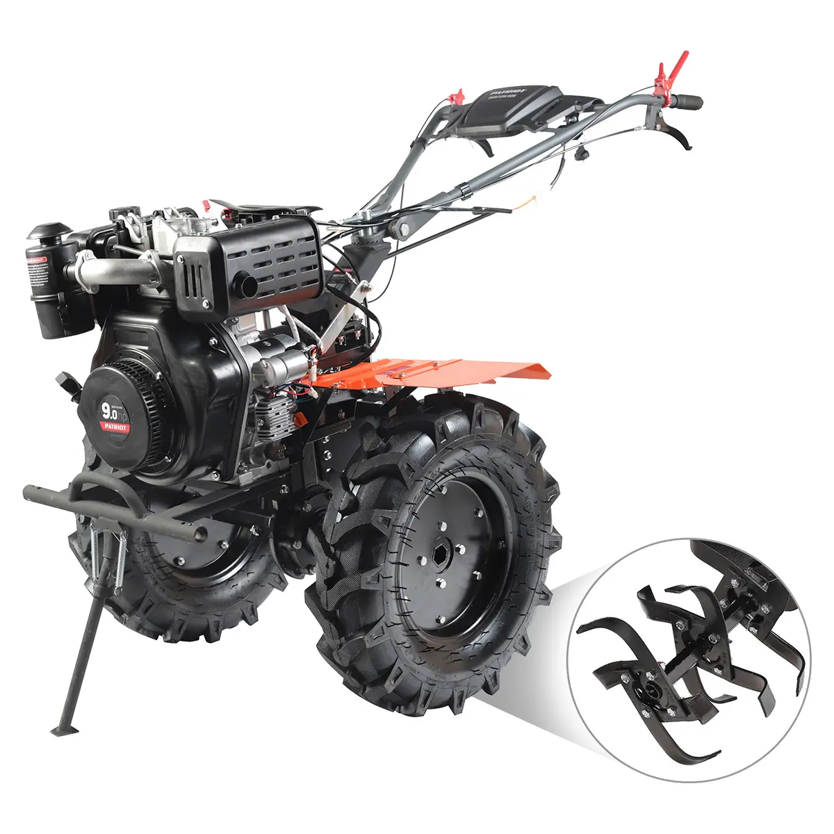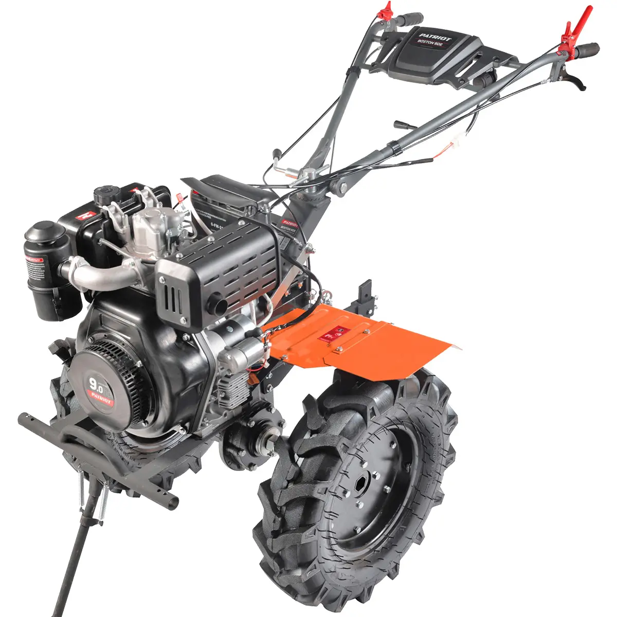 Мотоплуг Patriot Boston-9DE поставляется в комплекте с фрезами, а серповидная форма ножей позволяет вспахивать даже целину. Большие пневматические колеса тракторного типа делают его вездеходным, что позволяет без труда передвигаться по вязкой грязи, кочкам или песку. Каждое колесо также имеет защитное крыло, которое предотвращает попадание пыли и грязи во время работы.