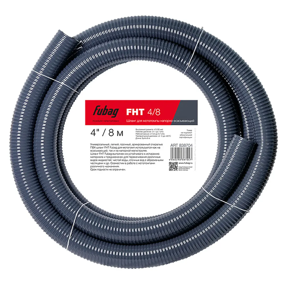 - Шланг FUBAG FHT 4/8 предназначен как для всасывающих, так и для напорных магистралей мотопомп. Это универсальное решение, которое подходит для разнообразных задач по перекачиванию жидкостей.
