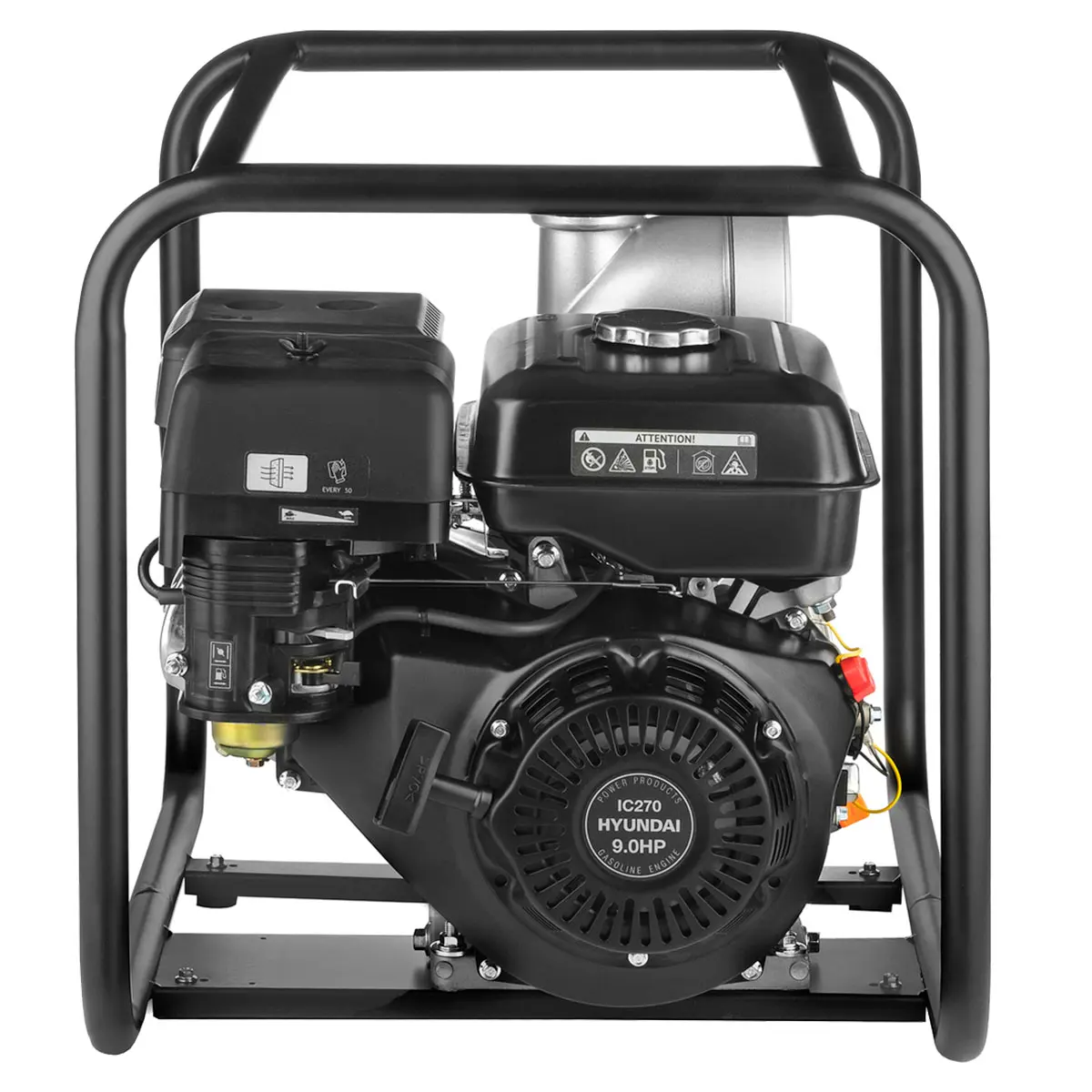 Фирменный двигатель HYUNDAI, установленный на мотопомпе, имеет мощность 9 л.с. и верхнее расположение клапанов. Это обеспечивает эффективную работу и надежность в любых условиях. В Hyundai HYT 100 используется обычный бензин, а емкость топливного бака составляет 6 л. Это гарантирует продолжительную работу без необходимости частой заправки. Объем масляного бака составляет 1.1 л, что обеспечивает надежную смазку всех деталей и повышает моторесурс двигателя до более чем 1500 моточасов.