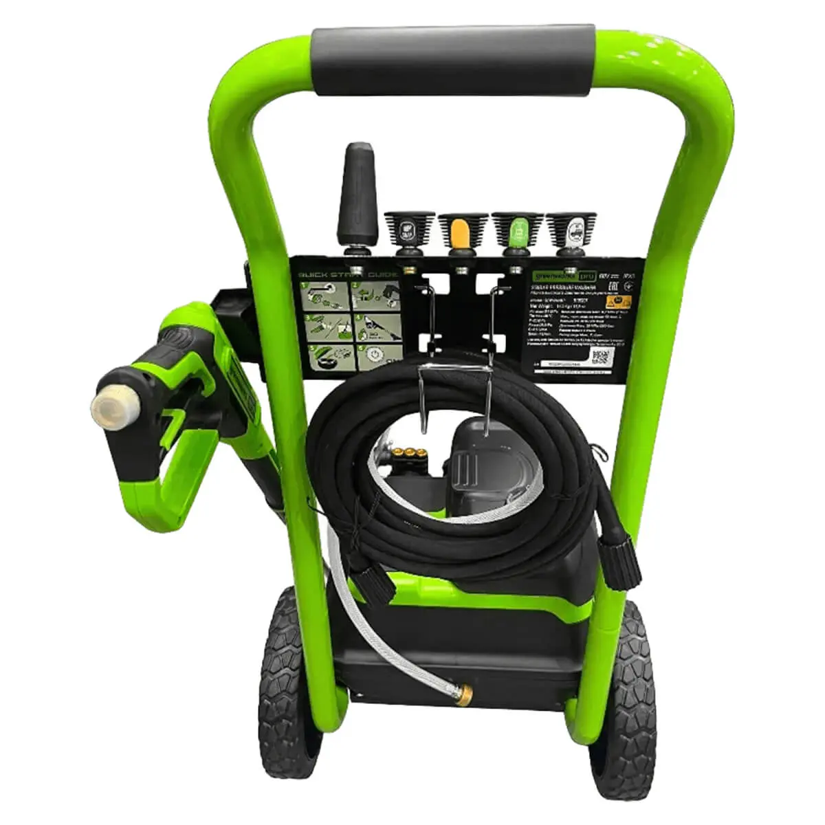 Мойка высокого давления с портом на два аккумулятора Greenworks 60V — мойка из серии 60V c максимальным давлением 250 бар, производительностью до 240 л/час и бесщеточным двигателем для очистки автотранспорта, садовой мебели и дорожек. Имеет 2 отсека для аккумуляторов.