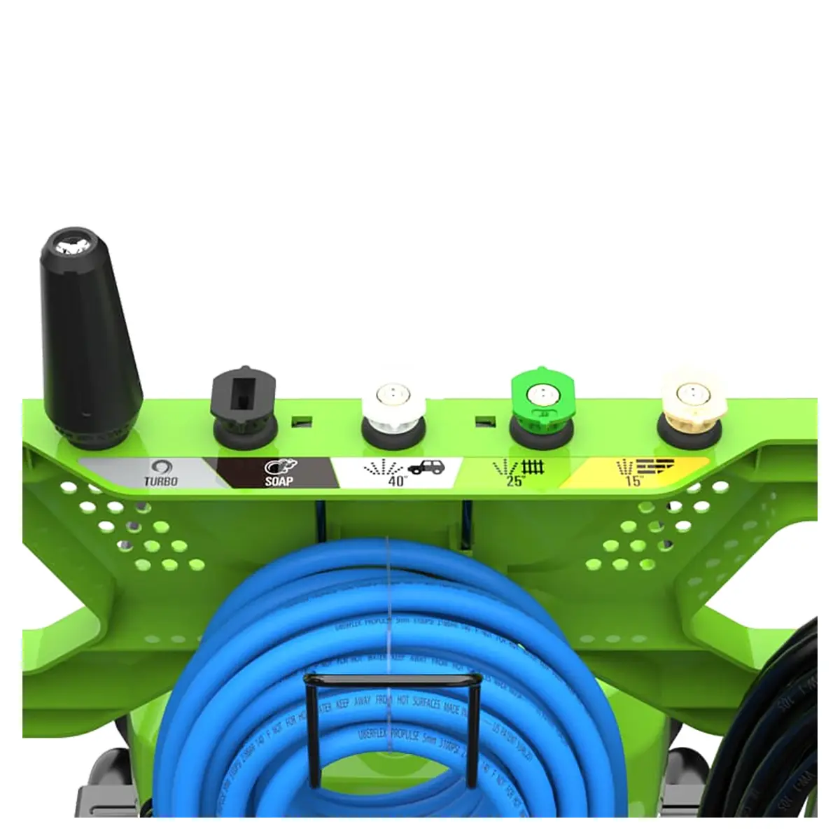 Резиновый шланг высокого давления длиной 7,6 м армирован стальной проволочной сеткой для максимальной прочности. Есть бак для моющего средства. Мойка высокого давления закреплена на прочной раме и имеет большие колеса для удобной транспортировки устройства. Насадки, шланг и электрический кабель закрепляются на ручке рамы, поэтому всегда находятся под рукой.