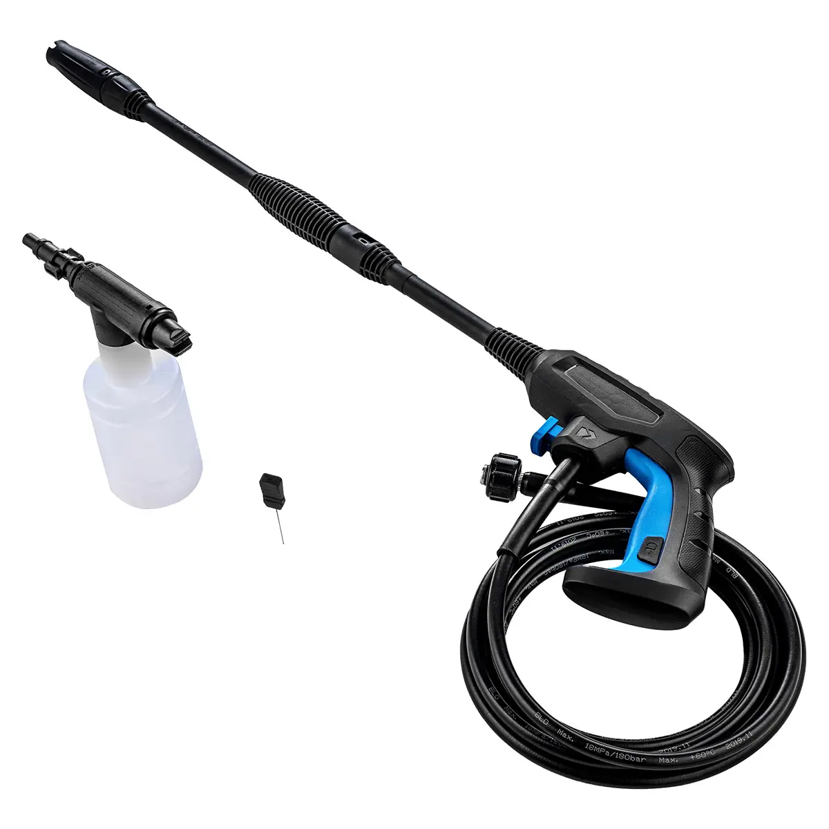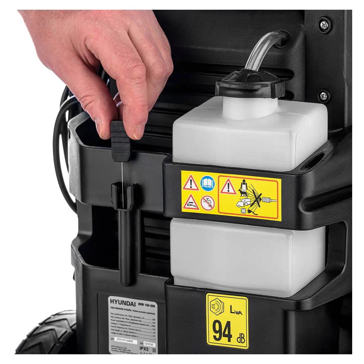 В комплект Hyundai HHW 150-500 входят: адаптер для шланга, инструмент для прочистки форсунки, бак для моющего средства, пистолет-распылитель с регулируемым давлением, насадка. Гибкий шланг длиной 6,5 м и электрокабель 5 м позволяют свободно перемещаться по участку. Дополнительно для эксплуатации придется приобрести шланг для воды с обратным клапаном, моющее средство и обратный клапан.